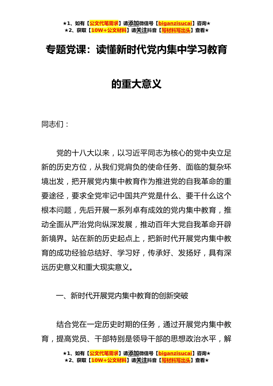★1、如有【公文代笔需求】请添加微信号【biganzisucai】咨询★★2、获取【10W+公文材料】请关注抖音【写材料写出头】查看★专题党课:读懂新时代党内集中学习教育的重大意义同志们:党的十八大以来,以习近平同志为核心的党中央立足新的历史方位,从我们党肩负的使命任务、面临的复杂环境出发,把开展党内集中教育作为推进党的自我革命的重要途径,要求全党牢记中国共产党是什么、要干什么这个根本问题,先后开展一系列卓有成效的党内集中教育,推动全面从严治党向纵深发展,推动百年大党自我革命开辟新境界。站在新的历史起点上,把新时代开展党内集中教育的成功经验总结好、学习好,传承好、发扬好,具有深远历史意义和重大现实意义。一、新时代开展党内集中教育的创新突破结合党在一定历史时期的任务,通过开...
