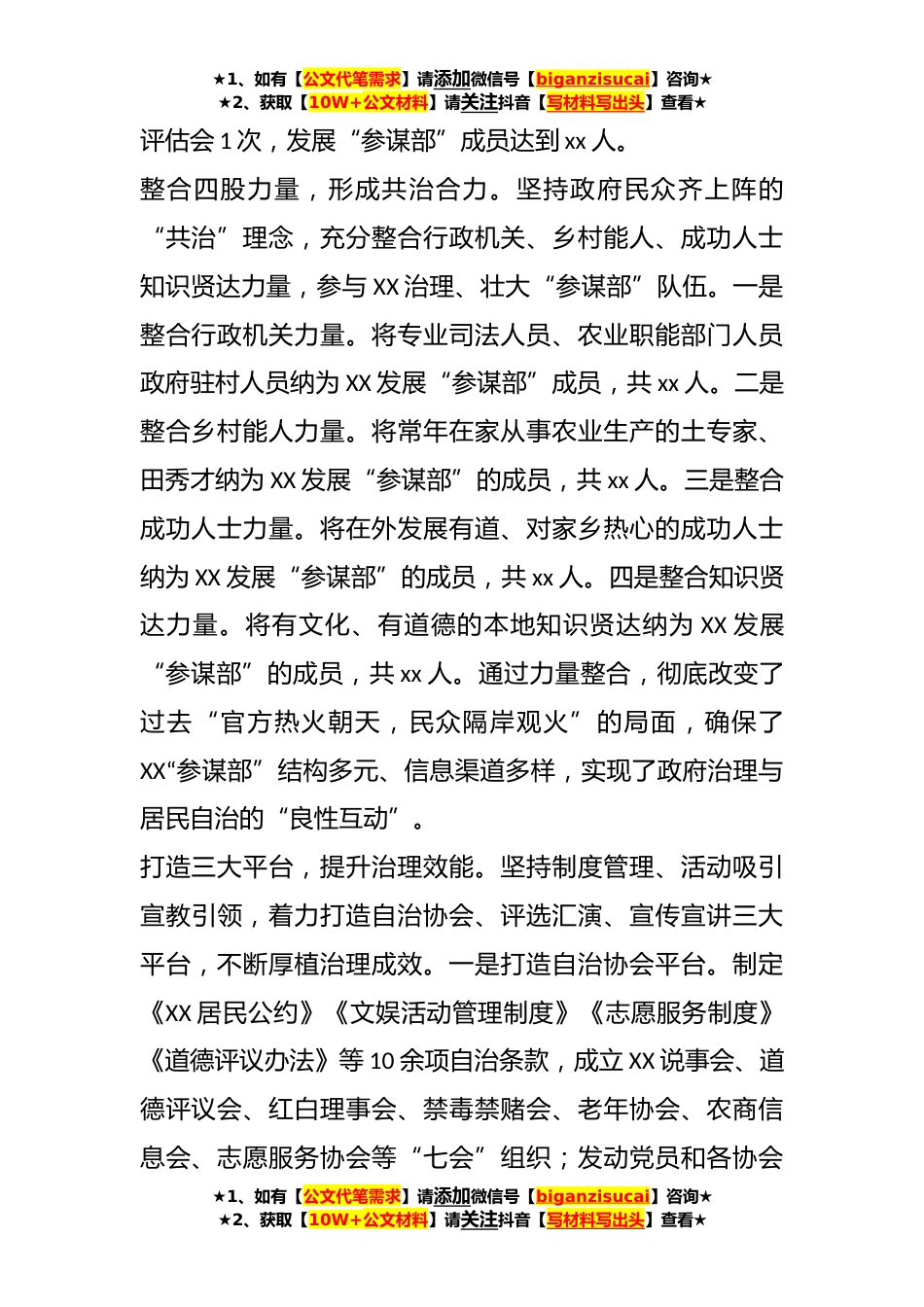 ★1、如有【公文代笔需求】请添加微信号【biganzisucai】咨询★★2、获取【10W+公文材料】请关注抖音【写材料写出头】查看★关于在基层治理的经验材料XXXX位于XX东南部,距XX2公里,占地面积X亩,共有居民130户512人,其中XX户73户246人,党员8名。为实现长远治理和健康发展,近年来,XX积极探索“建好用好参谋部”的治理方式,全力写好XX建设“后半篇”文章。健全三本台账,完善自治功能。坚持“评估—落实—上榜”自治原则,广泛收集在家在外居民意见建议,汇聚集体智慧,强化聚居管理。一是健全“季度评估”台账。每季度召开居民代表会议,邀请政府专业职能部门与会,在全员充分讨论的前提下对居民建议进行可行性评估,采取群众现场无记名投票、XX发展“参谋部”成员无记名投票、专业职能部门研判投票方式,按...