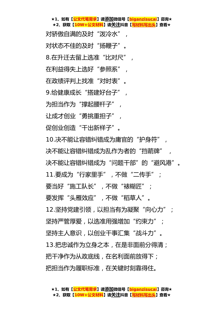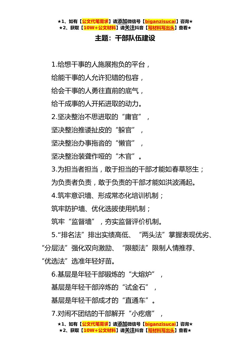 ★1、如有【公文代笔需求】请添加微信号【biganzisucai】咨询★★2、获取【10W+公文材料】请关注抖音【写材料写出头】查看★主题:干部队伍建设1.给想干事的人施展抱负的平台,给能干事的人允许犯错的包容,给会干事的人勇往直前的底气,给干成事的人开拓进取的动力。2.坚决整治不思进取的“庸官”,坚决整治推诿扯皮的“躲官”,坚决整治办事拖沓的“懒官”,坚决整治装聋作哑的“木官”。3.为担当者担当,敢于担当的干部才能如春草怒生;为负责者负责,敢于负责的干部才能如洪波涌起。4.筑牢意识墙、形成常态化培训机制;筑牢防护墙、优化选拔使用机制;筑牢“监督墙”,夯实监督评价机制。5.“排名法”排出实绩高低、“两头法”掌握表现优劣、“分层法”强化双向激励、“限额法”限制人情推荐、“优选法”选准...