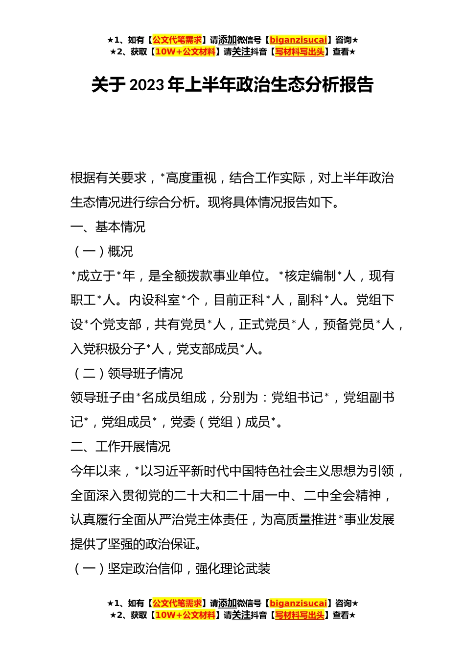★1、如有【公文代笔需求】请添加微信号【biganzisucai】咨询★★2、获取【10W+公文材料】请关注抖音【写材料写出头】查看★关于2023年上半年政治生态分析报告根据有关要求,*高度重视,结合工作实际,对上半年政治生态情况进行综合分析。现将具体情况报告如下。一、基本情况(一)概况*成立于*年,是全额拨款事业单位。*核定编制*人,现有职工*人。内设科室*个,目前正科*人,副科*人。党组下设*个党支部,共有党员*人,正式党员*人,预备党员*人,入党积极分子*人,党支部成员*人。(二)领导班子情况领导班子由*名成员组成,分别为:党组书记*,党组副书记*,党组成员*,党委(党组)成员*。二、工作开展情况今年以来,*以习近平新时代中国特色社会主义思想为引领,全面深入贯彻党的二十大和二十届一中、二中全...