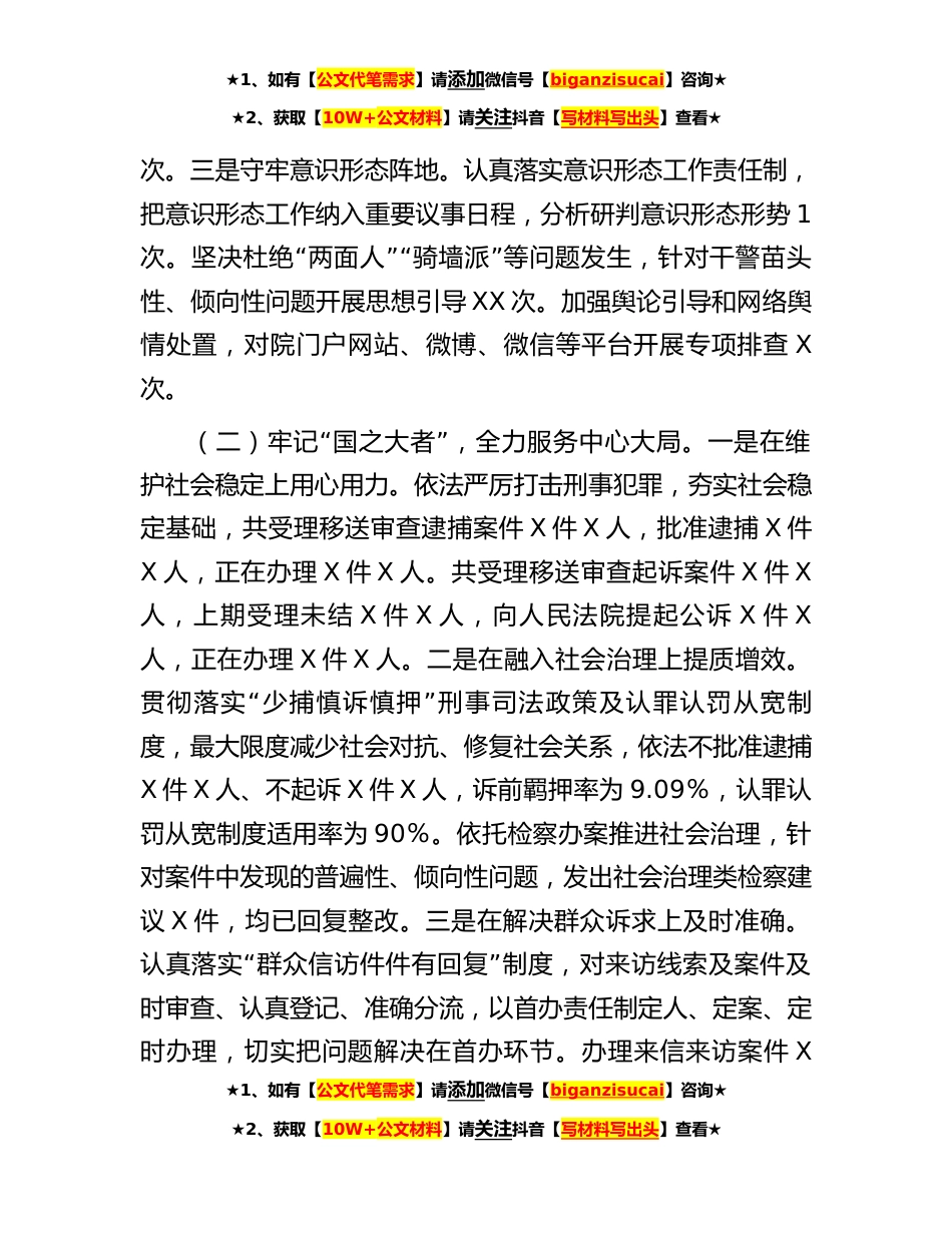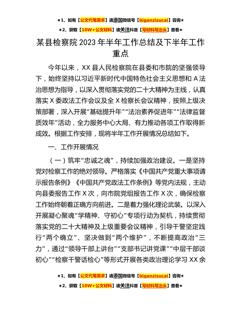 ★1、如有【公文代笔需求】请添加微信号【biganzisucai】咨询★★2、获取【10W+公文材料】请关注抖音【写材料写出头】查看★某县检察院2023年半年工作总结及下半年工作重点今年以来,XX县人民检察院在县委和市院的坚强领导下,始终坚持以习近平新时代中国特色社会主义思想和A法治思想为指导,以深入贯彻落实党的二十大精神为主线,认真落实X委政法工作会议及全X检察长会议精神,按照上级决“”“”“策部署,深入开展基础提升年法治素养促进年法律监督”质效年活动,全力服务中心大局、有力推动各项工作取得新成效。根据工作安排,现将半年工作开展情况总结如下。一、工作开展情况“”(一)筑牢忠诚之魂,持续加强政治建设。一是坚持党对检察工作的绝对领导。严格落实《中国共产党重大事项请示报告条例》《中国共...
