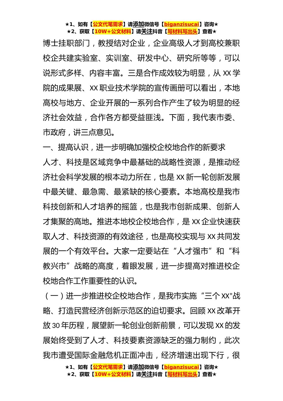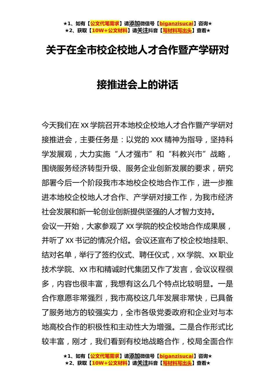 ★1、如有【公文代笔需求】请添加微信号【biganzisucai】咨询★★2、获取【10W+公文材料】请关注抖音【写材料写出头】查看★关于在全市校企校地人才合作暨产学研对接推进会上的讲话今天我们在XX学院召开本地校企校地人才合作暨产学研对接推进会,主要任务是:以党的XXX精神为指导,坚持科学发展观,大力实施“人才强市”和“科教兴市”战略,围绕服务经济转型升级、服务企业创新发展的要求,研究部署今后一个阶段我市本地校企校地合作工作,进一步推进本地校企校地人才合作、产学研对接工作,为我市经济社会发展和新一轮创业创新提供坚强的人才智力支持。会议一开始,大家参观了XX学院的校企校地合作成果展,并听了XX书记的情况介绍。会议还宣布了校企校地挂职、结对名单,举行了签约仪式、聘任仪式,XX学院、XX职...