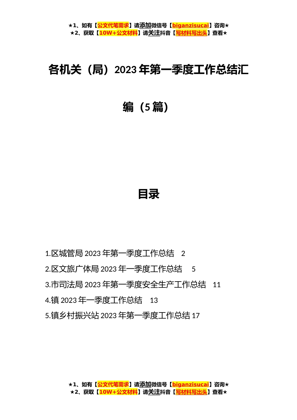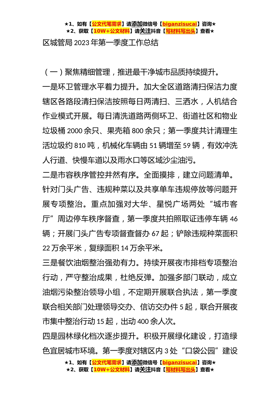 ★1、如有【公文代笔需求】请添加微信号【biganzisucai】咨询★★2、获取【10W+公文材料】请关注抖音【写材料写出头】查看★各机关(局)2023年第一季度工作总结汇编(5篇)目录1.区城管局2023年第一季度工作总结22.区文旅广体局2023年一季度工作总结53.市司法局2023年第一季度安全生产工作总结114.镇2023年一季度工作总结135.镇乡村振兴站2023年第一季度工作总结17★1、如有【公文代笔需求】请添加微信号【biganzisucai】咨询★★2、获取【10W+公文材料】请关注抖音【写材料写出头】查看★★1、如有【公文代笔需求】请添加微信号【biganzisucai】咨询★★2、获取【10W+公文材料】请关注抖音【写材料写出头】查看★区城管局2023年第一季度工作总结(一)聚焦精细管理,推进最干净城市品质持续提升。一是环卫管理水...