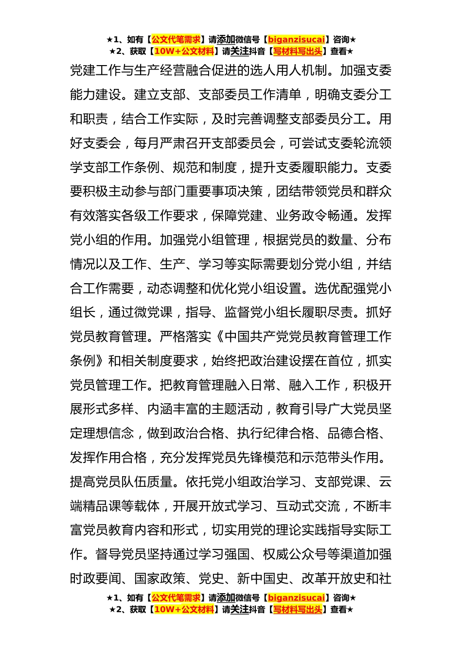 ★1、如有【公文代笔需求】请添加微信号【biganzisucai】咨询★★2、获取【10W+公文材料】请关注抖音【写材料写出头】查看★在党支部专题读书班上的党课辅导报告:怎样做好新时代支部工作同志们:一直以来,党中央高度重视党支部建设,要求把全面从严治党落实到每个支部、每名党员,推动全党形成大抓基层大抓支部的良好态势。按照《2023年XX局机关党支部重点工作方案》安排,今天我以《怎样做好新时代支部工作》为题,为大家作专题党课辅导,从建强支部班子、强化理论武装、发挥党员作用、凝聚服务职工、做实规范化建设和强化作风建设等方面,与大家一起交流学习,进一步校准前进方向,锚定奋斗目标,以更高站位、更实举措、更硬作风的实际行动抓实抓细新时代党支部工作。第一,要建强支部班子,提升领导力。选优...