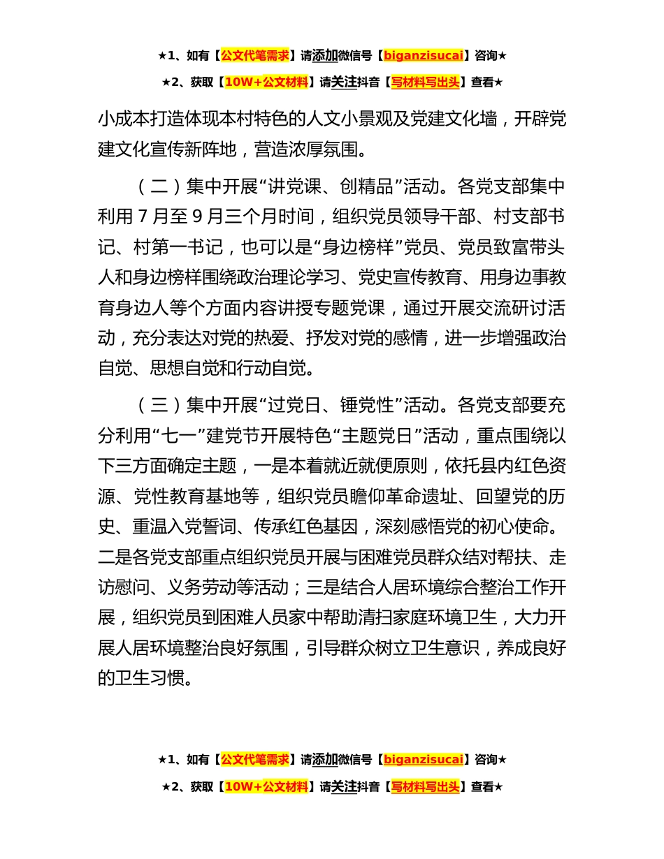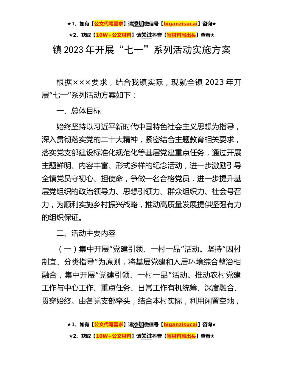 ★1、如有【公文代笔需求】请添加微信号【biganzisucai】咨询★★2、获取【10W+公文材料】请关注抖音【写材料写出头】查看★镇2023年开展“七一”系列活动实施方案根据×××要求,结合我镇实际,现就全镇2023年开“”展七一系列活动方案如下:一、总体目标始终坚持以习近平新时代中国特色社会主义思想为指导,深入贯彻落实党的二十大精神,紧密结合主题教育相关要求,落实党支部建设标准化规范化等基层党建重点任务,通过开展主题鲜明、内容丰富、形式多样的纪念活动,进一步激励引导全镇党员守初心、担使命,争做一名合格党员,进一步提升基层党组织的政治领导力、思想引领力、群众组织力、社会号召力,为顺利实施乡村振兴战略,推动高质量发展提供坚强有力的组织保证。二、活动主要内容“”“(一)集中开展党...