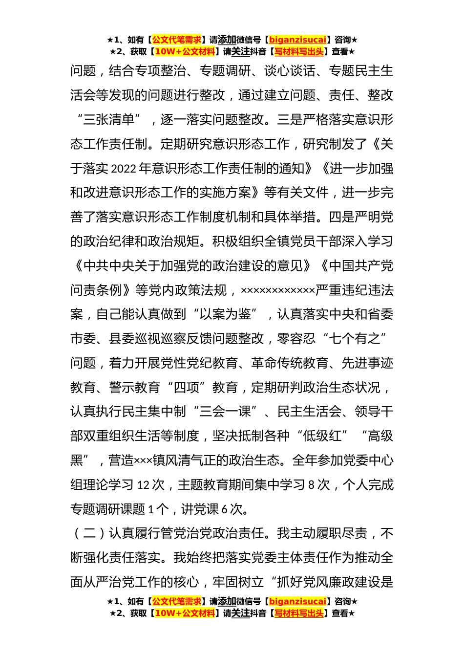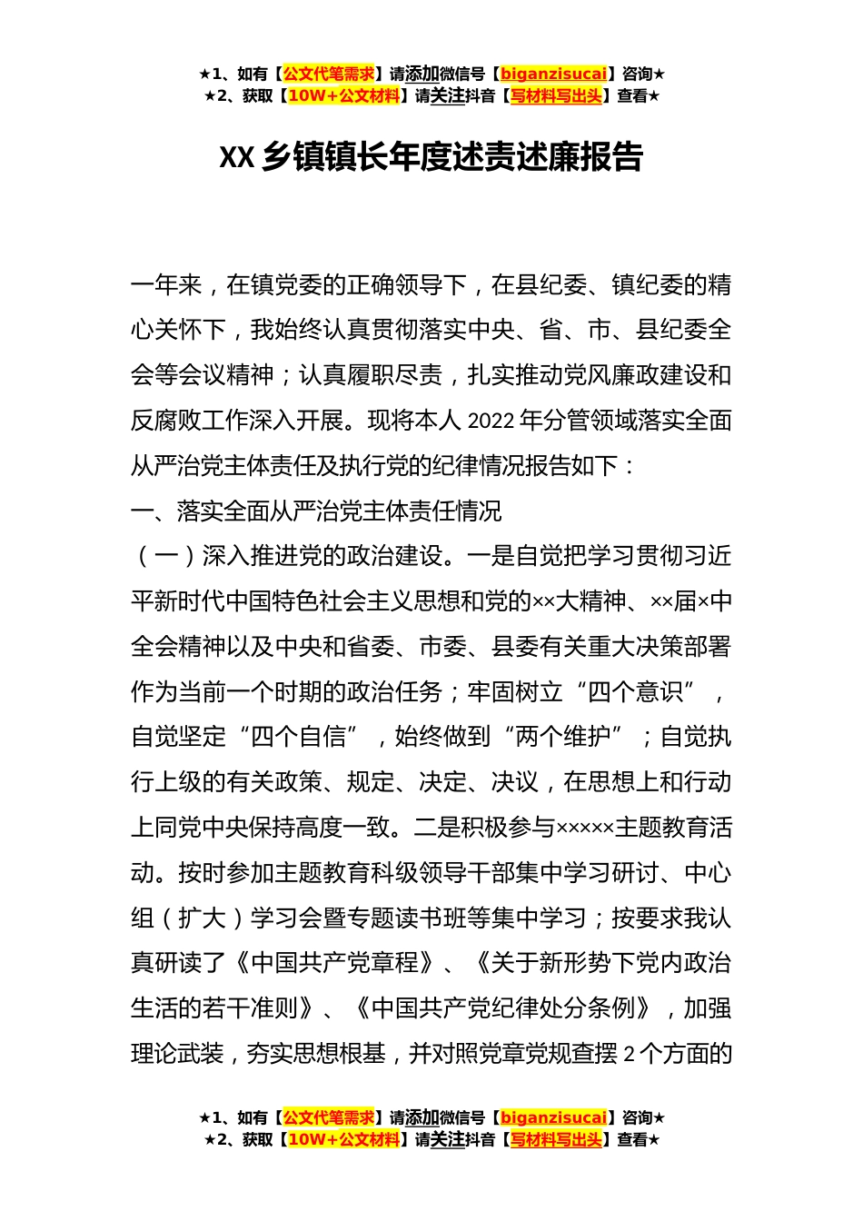 ★1、如有【公文代笔需求】请添加微信号【biganzisucai】咨询★★2、获取【10W+公文材料】请关注抖音【写材料写出头】查看★XX乡镇镇长年度述责述廉报告一年来,在镇党委的正确领导下,在县纪委、镇纪委的精心关怀下,我始终认真贯彻落实中央、省、市、县纪委全会等会议精神;认真履职尽责,扎实推动党风廉政建设和反腐败工作深入开展。现将本人2022年分管领域落实全面从严治党主体责任及执行党的纪律情况报告如下:一、落实全面从严治党主体责任情况(一)深入推进党的政治建设。一是自觉把学习贯彻习近平新时代中国特色社会主义思想和党的××大精神、××届×中全会精神以及中央和省委、市委、县委有关重大决策部署作为当前一个时期的政治任务;牢固树立“四个意识”,自觉坚定“四个自信”,始终做到“两个维...