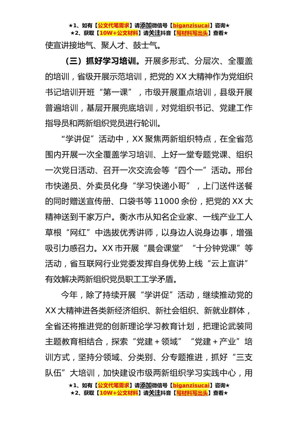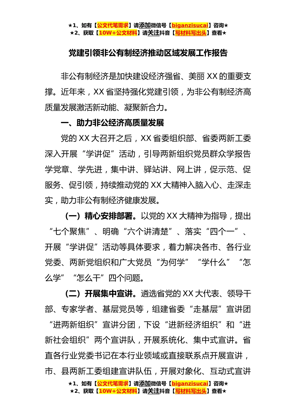 ★1、如有【公文代笔需求】请添加微信号【biganzisucai】咨询★★2、获取【10W+公文材料】请关注抖音【写材料写出头】查看★党建引领非公有制经济推动区域发展工作报告非公有制经济是加快建设经济强省、美丽XX的重要支撑。近年来,XX省坚持强化党建引领,为非公有制经济高质量发展激活新动能、凝聚新合力。一、助力非公经济高质量发展党的XX大召开之后,XX省委组织部、省委两新工委深入开展“学讲促”活动,引导两新组织党员群众学报告学党章、学先进,集中讲、驿站讲、网上讲,促示范、促服务、促引领,持续推动党的XX大精神入脑入心、走深走实,助力非公有制经济健康发展。(一)精心安排部署。以党的XX大精神为指导,提出“七个聚焦”、明确“六个讲清楚”、落实“四个一”、开展“学讲促”活动等具体要求,着...