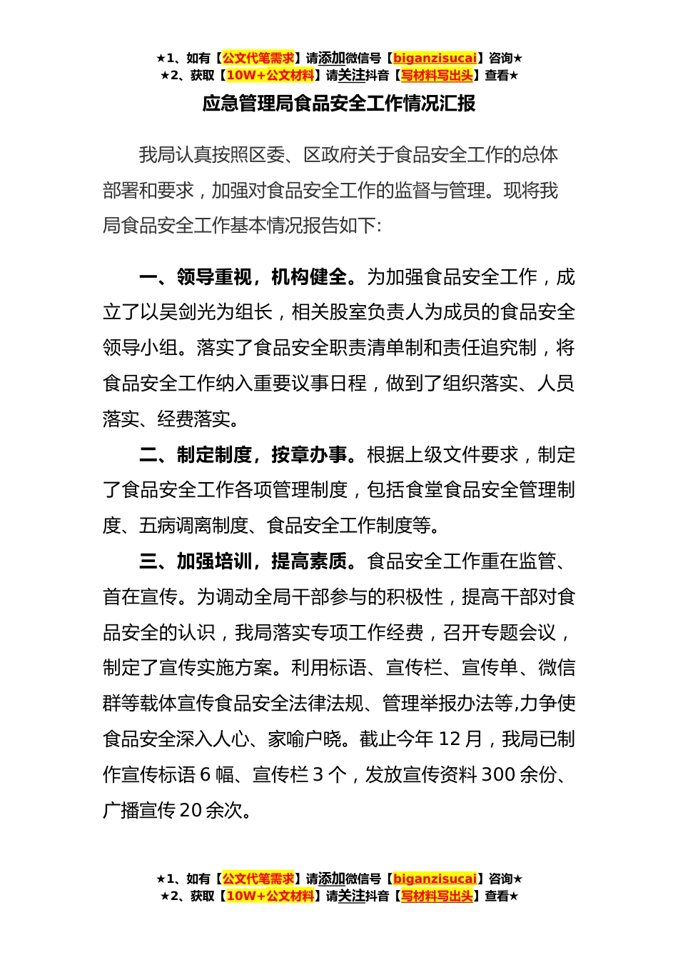 ★1、如有【公文代笔需求】请添加微信号【biganzisucai】咨询★★2、获取【10W+公文材料】请关注抖音【写材料写出头】查看★应急管理局食品安全工作情况汇报我局认真按照区委、区政府关于食品安全工作的总体部署和要求,加强对食品安全工作的监督与管理。现将我局食品安全工作基本情况报告如下:一、领导重视,机构健全。为加强食品安全工作,成立了以吴剑光为组长,相关股室负责人为成员的食品安全领导小组。落实了食品安全职责清单制和责任追究制,将食品安全工作纳入重要议事日程,做到了组织落实、人员落实、经费落实。二、制定制度,按章办事。根据上级文件要求,制定了食品安全工作各项管理制度,包括食堂食品安全管理制度、五病调离制度、食品安全工作制度等。三、加强培训,提高素质。食品安全工作重在监管...
