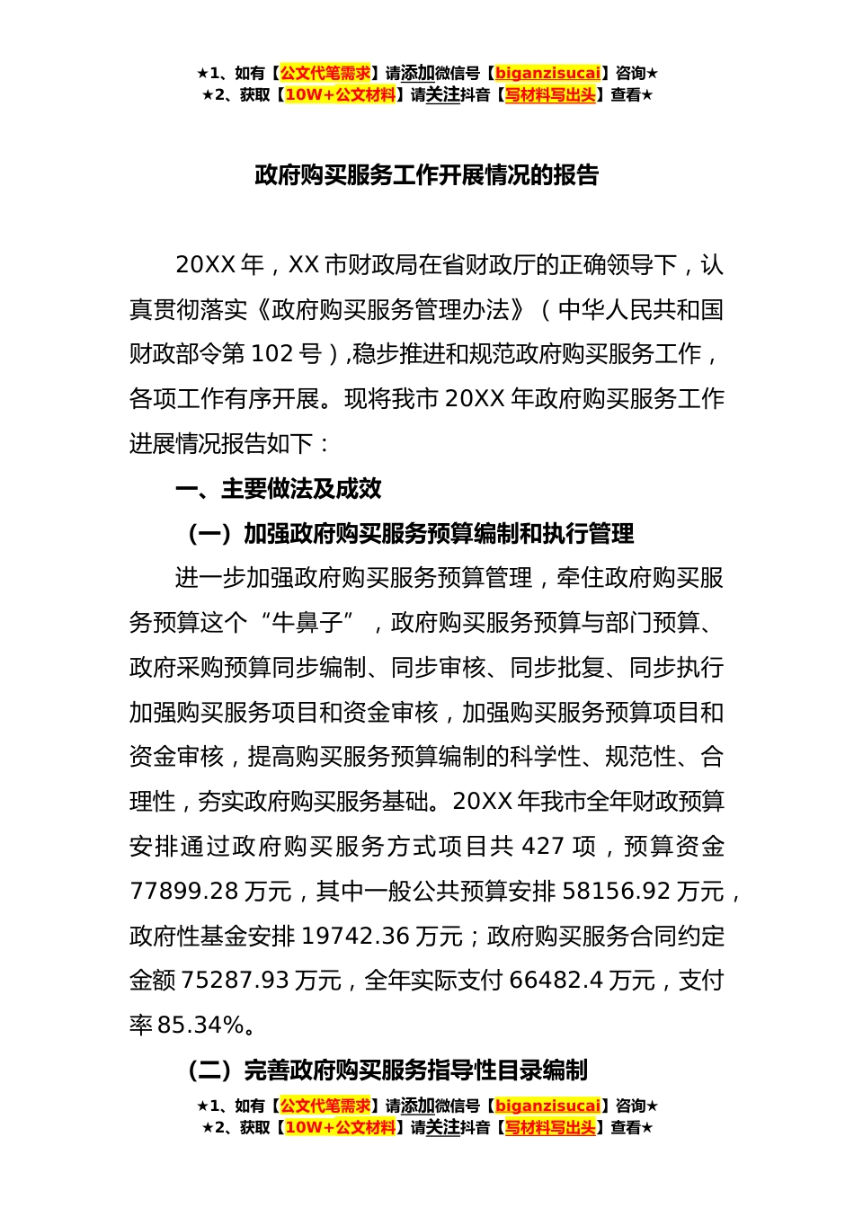 ★1、如有【公文代笔需求】请添加微信号【biganzisucai】咨询★★2、获取【10W+公文材料】请关注抖音【写材料写出头】查看★政府购买服务工作开展情况的报告20XX年,XX市财政局在省财政厅的正确领导下,认真贯彻落实《政府购买服务管理办法》(中华人民共和国财政部令第102号),稳步推进和规范政府购买服务工作,各项工作有序开展。现将我市20XX年政府购买服务工作进展情况报告如下:一、主要做法及成效(一)加强政府购买服务预算编制和执行管理进一步加强政府购买服务预算管理,牵住政府购买服务预算这个“牛鼻子”,政府购买服务预算与部门预算、政府采购预算同步编制、同步审核、同步批复、同步执行加强购买服务项目和资金审核,加强购买服务预算项目和资金审核,提高购买服务预算编制的科学性、规范性、合理...