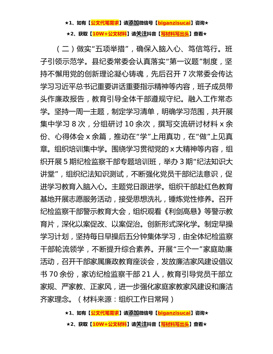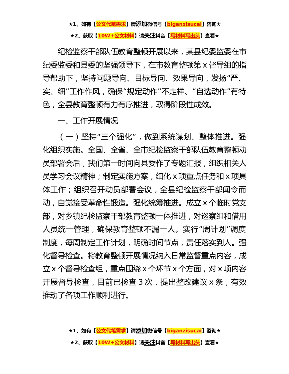 ★1、如有【公文代笔需求】请添加微信号【biganzisucai】咨询★★2、获取【10W+公文材料】请关注抖音【写材料写出头】查看★纪检监察干部队伍教育整顿开展以来,某县纪委监委在市纪委监委和县委的坚强领导下,在市教育整顿第x督导组的指“导帮助下,坚持问题导向、目标导向、效果导向,发扬严、”“”“”实、细工作作风,确保规定动作不走样、自选动作有特色,全县教育整顿有力有序推进,取得阶段性成效。一、工作开展情况“”(一)坚持三个强化,做到系统谋划、整体推进。强化组织实施。全国、全省、全市纪检监察干部队伍教育整顿动员部署会后,我们第一时间向县委作了专题汇报,组织相关人员学习会议精神;制定实施方案,细化x项重点任务和x项具体工作;组织召开动员部署会议,全县纪检监察干部闻令而动,自觉...
