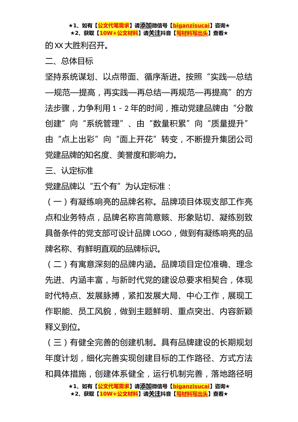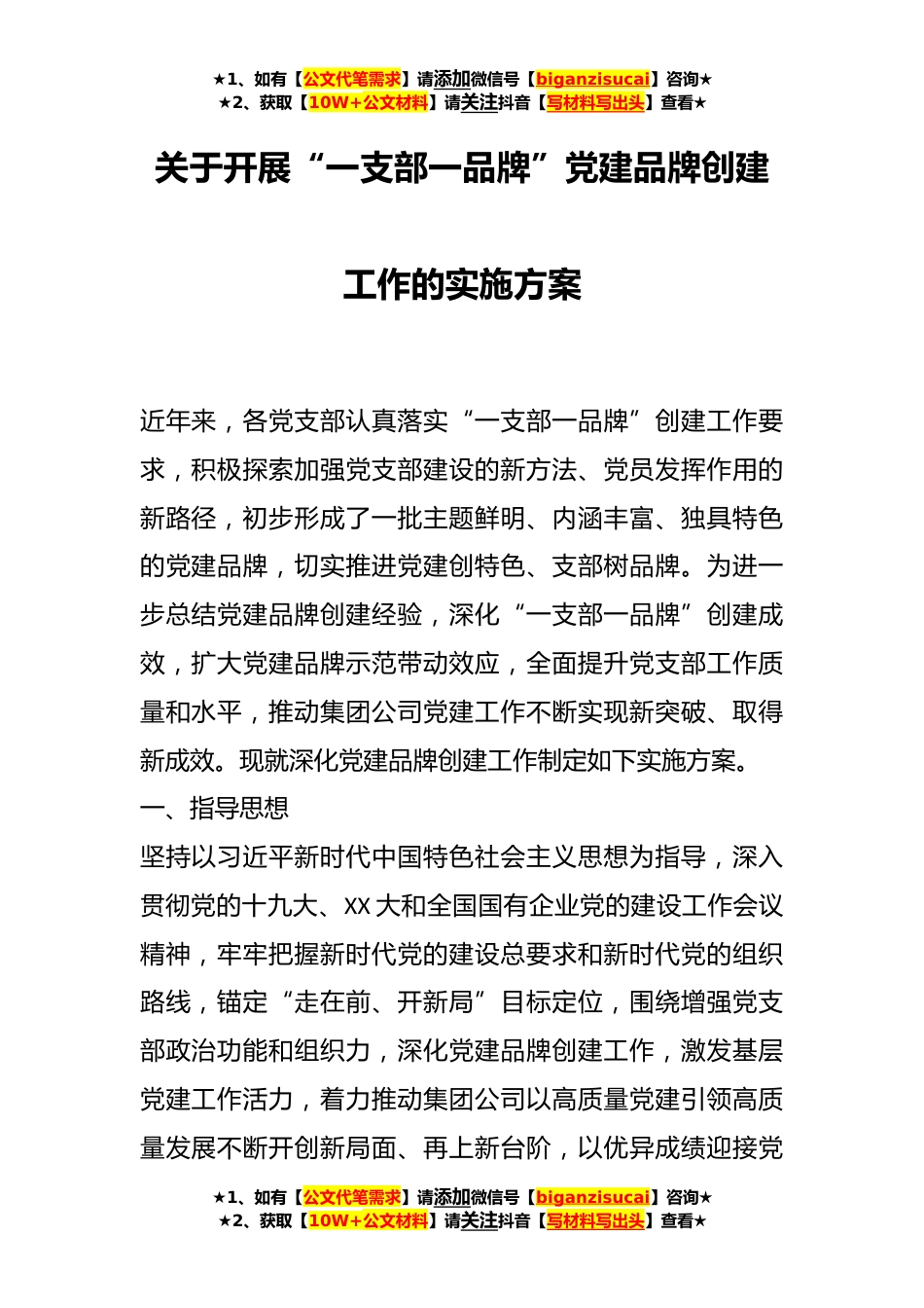 ★1、如有【公文代笔需求】请添加微信号【biganzisucai】咨询★★2、获取【10W+公文材料】请关注抖音【写材料写出头】查看★关于开展“一支部一品牌”党建品牌创建工作的实施方案近年来,各党支部认真落实“一支部一品牌”创建工作要求,积极探索加强党支部建设的新方法、党员发挥作用的新路径,初步形成了一批主题鲜明、内涵丰富、独具特色的党建品牌,切实推进党建创特色、支部树品牌。为进一步总结党建品牌创建经验,深化“一支部一品牌”创建成效,扩大党建品牌示范带动效应,全面提升党支部工作质量和水平,推动集团公司党建工作不断实现新突破、取得新成效。现就深化党建品牌创建工作制定如下实施方案。一、指导思想坚持以习近平新时代中国特色社会主义思想为指导,深入贯彻党的十九大、XX大和全国国有企业...