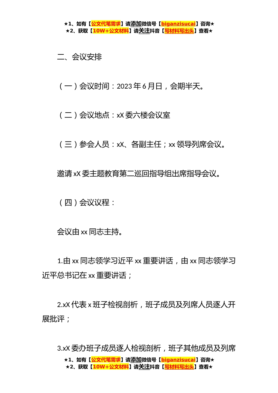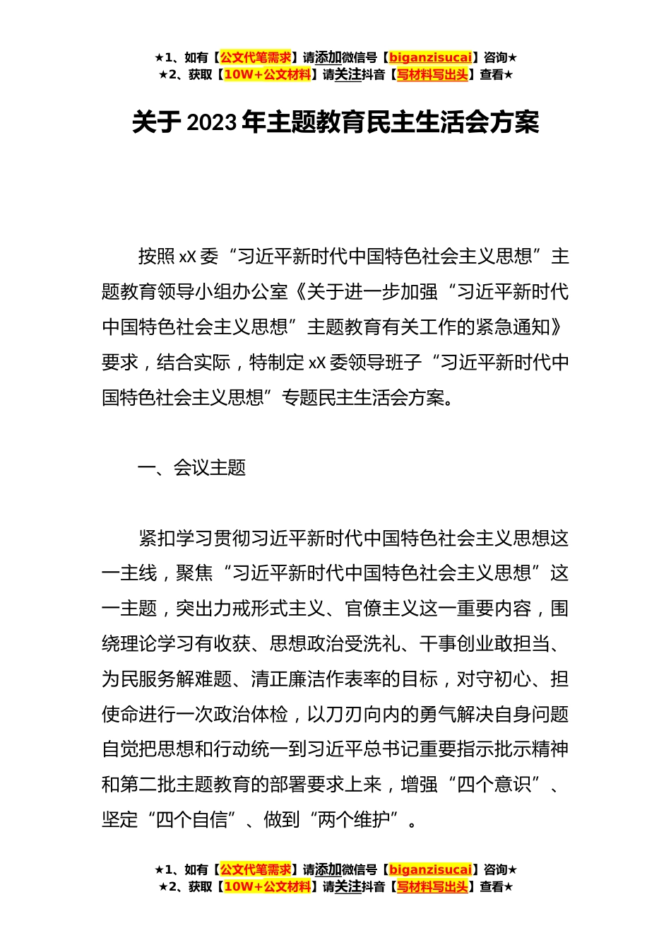 ★1、如有【公文代笔需求】请添加微信号【biganzisucai】咨询★★2、获取【10W+公文材料】请关注抖音【写材料写出头】查看★关于2023年主题教育民主生活会方案按照xX委“习近平新时代中国特色社会主义思想”主题教育领导小组办公室《关于进一步加强“习近平新时代中国特色社会主义思想”主题教育有关工作的紧急通知》要求,结合实际,特制定xX委领导班子“习近平新时代中国特色社会主义思想”专题民主生活会方案。一、会议主题紧扣学习贯彻习近平新时代中国特色社会主义思想这一主线,聚焦“习近平新时代中国特色社会主义思想”这一主题,突出力戒形式主义、官僚主义这一重要内容,围绕理论学习有收获、思想政治受洗礼、干事创业敢担当、为民服务解难题、清正廉洁作表率的目标,对守初心、担使命进行一次政治体检...