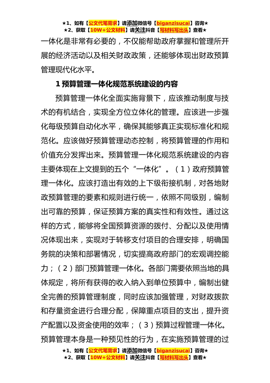 ★1、如有【公文代笔需求】请添加微信号【biganzisucai】咨询★★2、获取【10W+公文材料】请关注抖音【写材料写出头】查看★依托预算管理一体化规范全面提高预算管理规范化和标准化水平摘要:随着国家经济的蓬勃发展,各界对预算管理制度也越来越重视。我国突出深化税费体制改革,建立现代预算制度的要求。目前,我国现代预算制度的框架和制度已经基本建立,但与党的十九大提出的建设预算制度的目标和要求相比,还有很大的差距。差距和深化改革仍面临诸多挑战。提高预算管理精细化和规范化水平,构建全球预算管理一体化体系势在必行。综合预算综合管理信息系统是指利用现代先进的云计算等信息技术,将统一的预算管理系统集成到云平台中,打造“系统+技术”的管理架构,实现财务活动的规范化、规范化管理;融合利用...