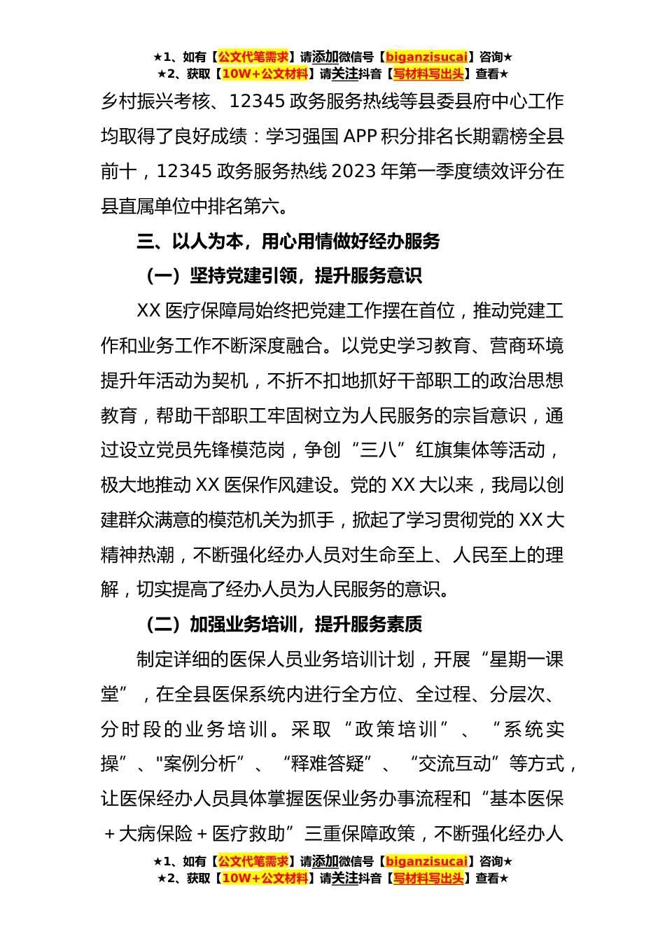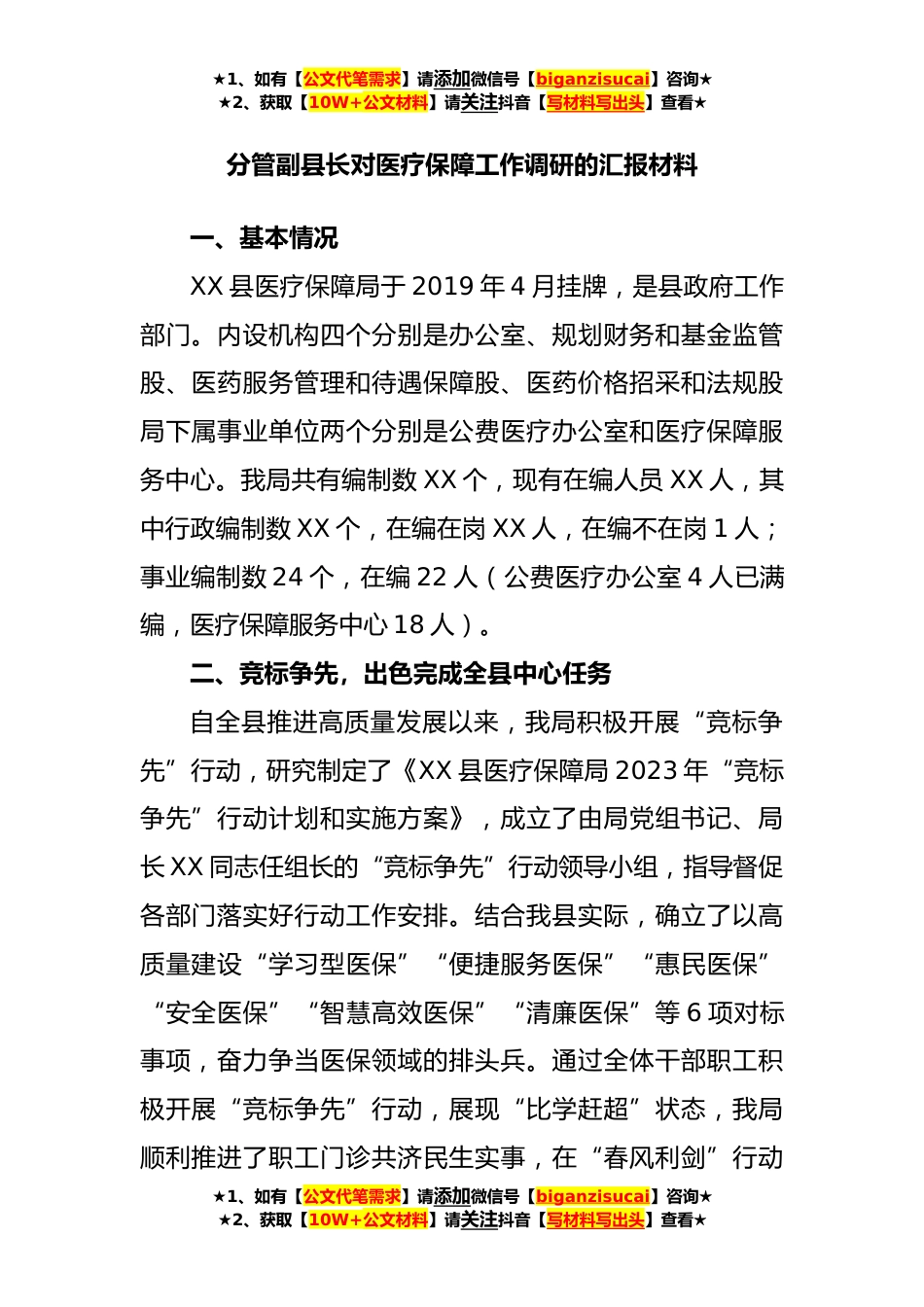 ★1、如有【公文代笔需求】请添加微信号【biganzisucai】咨询★★2、获取【10W+公文材料】请关注抖音【写材料写出头】查看★分管副县长对医疗保障工作调研的汇报材料一、基本情况XX县医疗保障局于2019年4月挂牌,是县政府工作部门。内设机构四个分别是办公室、规划财务和基金监管股、医药服务管理和待遇保障股、医药价格招采和法规股局下属事业单位两个分别是公费医疗办公室和医疗保障服务中心。我局共有编制数XX个,现有在编人员XX人,其中行政编制数XX个,在编在岗XX人,在编不在岗1人;事业编制数24个,在编22人(公费医疗办公室4人已满编,医疗保障服务中心18人)。二、竞标争先,出色完成全县中心任务自全县推进高质量发展以来,我局积极开展“竞标争先”行动,研究制定了《XX县医疗保障局2023年“竞标争先”...