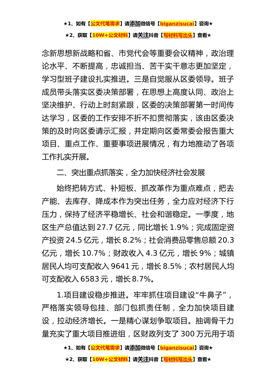 ★1、如有【公文代笔需求】请添加微信号【biganzisucai】咨询★★2、获取【10W+公文材料】请关注抖音【写材料写出头】查看★区政府领导班子运行情况汇报换届以来,区政府领导班子在市委、市政府和区委的坚强领导下,在区人大、区政协的监督支持下,团结带领“全区广大干部群众,紧紧围绕市委五个xx”“建设和区委打造三区两城一中心,建设幸福美丽新xx”奋斗目标,积极应对经济下行压力,凝心聚力、锐意进取,主动作为、真抓实干,各项工作有序推进,全区经济社会发展实现了稳中求进、稳中向好的良好局面。现就新一届区政府班子工作情况报告如下:一、围绕大局高站位,坚决服从党的绝对领导面对新形势、新任务,区政府始终把加强班子自身建设作为推动落实的关键来抓,着力提高班子善谋事、会干事、干成事的能力。...