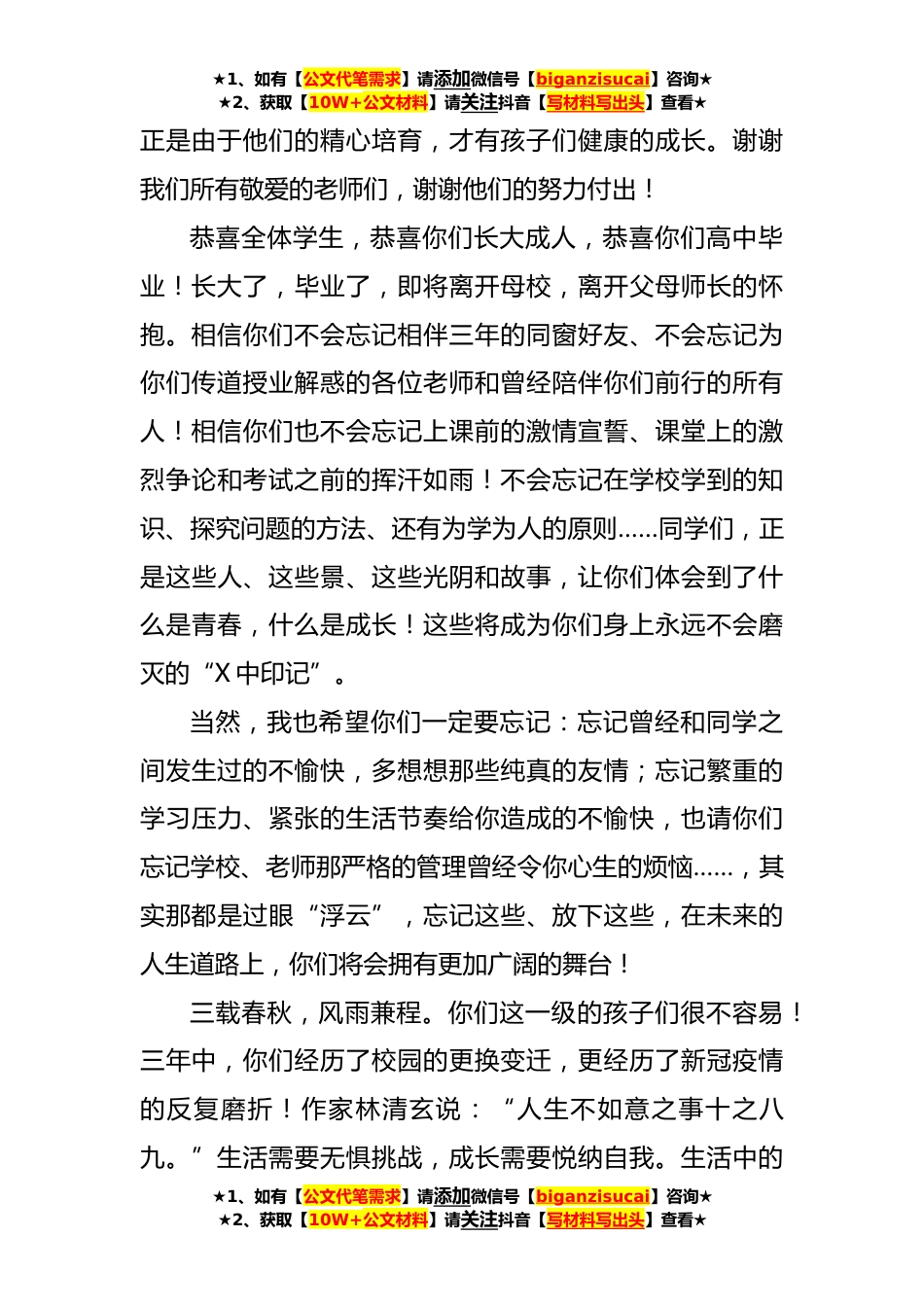 ★1、如有【公文代笔需求】请添加微信号【biganzisucai】咨询★★2、获取【10W+公文材料】请关注抖音【写材料写出头】查看★在2020级学生成人礼暨毕业典礼上的讲话尊敬的各位家长、老师们、同学们:草木争荣惜别时,鼓蓬扬帆远征日。今天是一个值得纪念的日子,我们在这里集会,为2020级的孩子们举行十八岁成人礼暨毕业典礼!经过三年的努力,同学们健康成长,已经长大成人,并且顺利地完成了高中学业,即将奔赴人生的新阶段。在此,我首先代表学校向全体同学表示热烈的祝贺!非常欢迎各位家长来参加今天的活动!你们含辛茹苦、倾注心血、倾其所有地养育孩子,你们总是在付出,从不求回报。我也是过来人,为了孩子的成长,我们做家长的付出了太多。我相信你们的内心现在会有诸多的感慨:我们盼望孩子们尽快长大,...