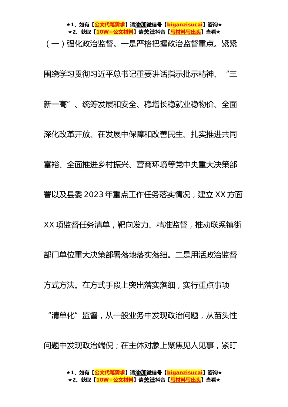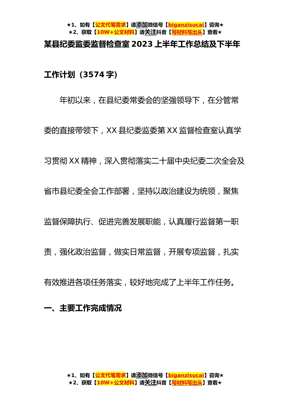 ★1、如有【公文代笔需求】请添加微信号【biganzisucai】咨询★★2、获取【10W+公文材料】请关注抖音【写材料写出头】查看★某县纪委监委监督检查室2023上半年工作总结及下半年工作计划(3574字)年初以来,在县纪委常委会的坚强领导下,在分管常委的直接带领下,XX县纪委监委第XX监督检查室认真学习贯彻XX精神,深入贯彻落实二十届中央纪委二次全会及省市县纪委全会工作部署,坚持以政治建设为统领,聚焦监督保障执行、促进完善发展职能,认真履行监督第一职责,强化政治监督,做实日常监督,开展专项监督,扎实有效推进各项任务落实,较好地完成了上半年工作任务。一、主要工作完成情况★1、如有【公文代笔需求】请添加微信号【biganzisucai】咨询★★2、获取【10W+公文材料】请关注抖音【写材料写出头】查看★...