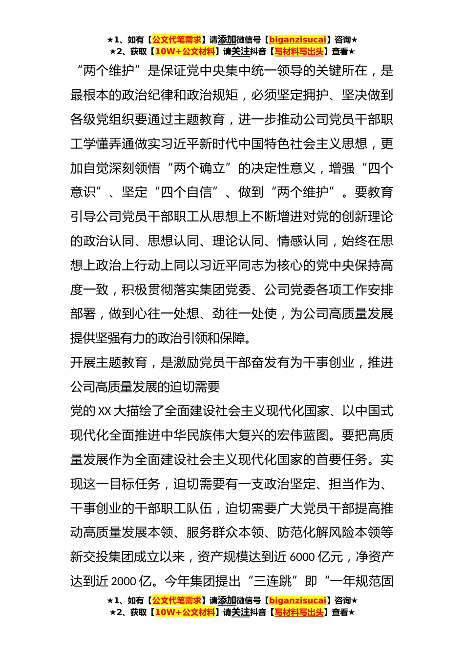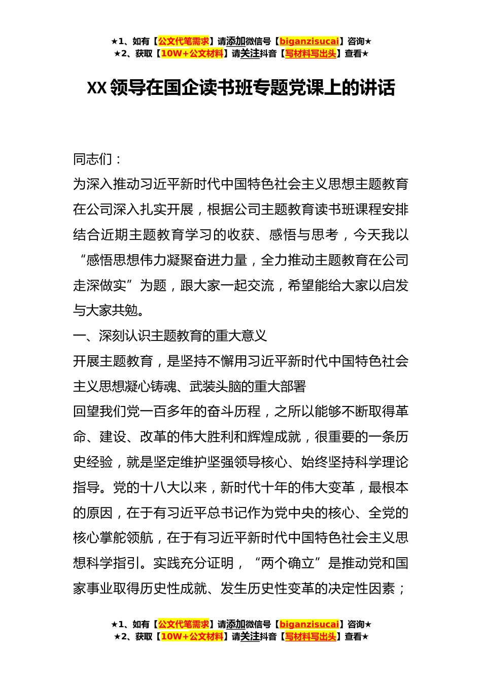 ★1、如有【公文代笔需求】请添加微信号【biganzisucai】咨询★★2、获取【10W+公文材料】请关注抖音【写材料写出头】查看★XX领导在国企读书班专题党课上的讲话同志们:为深入推动习近平新时代中国特色社会主义思想主题教育在公司深入扎实开展,根据公司主题教育读书班课程安排结合近期主题教育学习的收获、感悟与思考,今天我以“感悟思想伟力凝聚奋进力量,全力推动主题教育在公司走深做实”为题,跟大家一起交流,希望能给大家以启发与大家共勉。一、深刻认识主题教育的重大意义开展主题教育,是坚持不懈用习近平新时代中国特色社会主义思想凝心铸魂、武装头脑的重大部署回望我们党一百多年的奋斗历程,之所以能够不断取得革命、建设、改革的伟大胜利和辉煌成就,很重要的一条历史经验,就是坚定维护坚强领导...