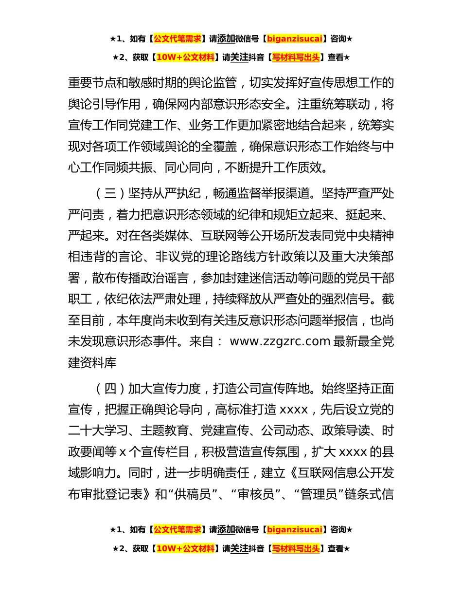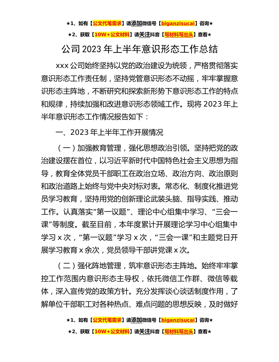 ★1、如有【公文代笔需求】请添加微信号【biganzisucai】咨询★★2、获取【10W+公文材料】请关注抖音【写材料写出头】查看★公司2023年上半年意识形态工作总结xxx公司始终坚持以党的政治建设为统领,严格贯彻落实意识形态工作责任制,坚持党管意识形态不动摇,牢牢掌握意识形态主阵地,不断研究和探索新形势下意识形态工作的特点和规律,持续加强和改进意识形态领域工作。现将2023年上半年意识形态工作情况报告如下:一、2023年上半年工作开展情况(一)加强教育管理,强化思想政治引领。坚持把党的政治建设摆在首位,以习近平新时代中国特色社会主义思想为指导,教育全体党员干部职工在政治立场、政治方向、政治原则和政治道路上始终与党中央对标对表。常态化、制度化推进党员学习教育,坚持用党的创新理论武装头...