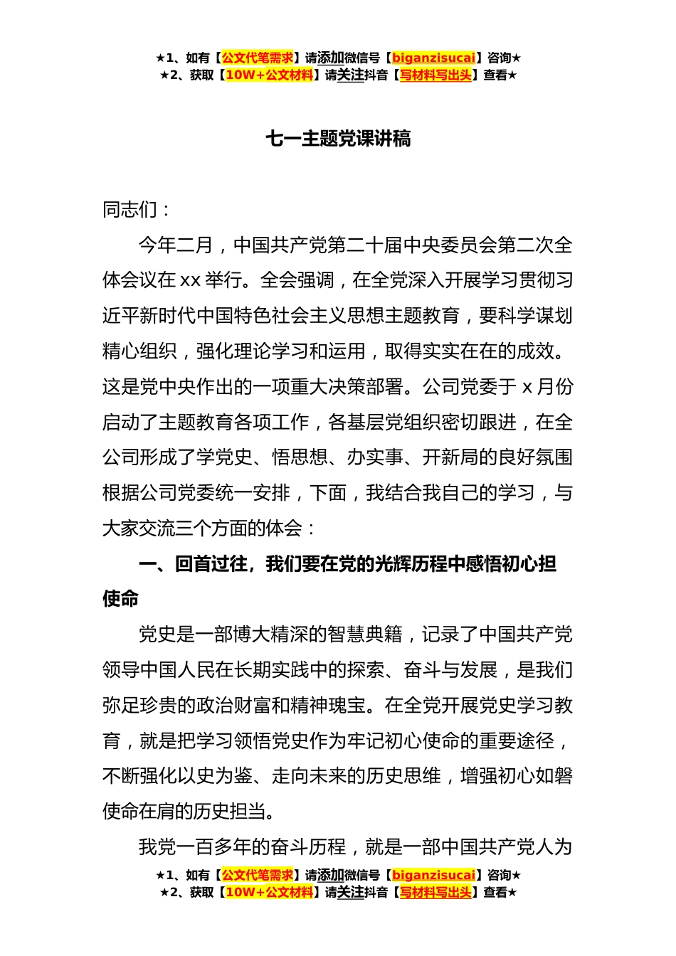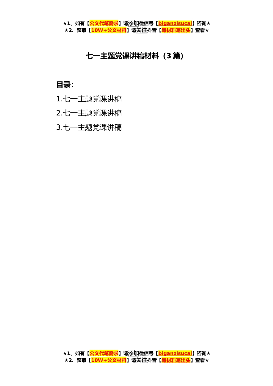 ★1、如有【公文代笔需求】请添加微信号【biganzisucai】咨询★★2、获取【10W+公文材料】请关注抖音【写材料写出头】查看★七一主题党课讲稿材料(3篇)目录:1.七一主题党课讲稿2.七一主题党课讲稿3.七一主题党课讲稿★1、如有【公文代笔需求】请添加微信号【biganzisucai】咨询★★2、获取【10W+公文材料】请关注抖音【写材料写出头】查看★★1、如有【公文代笔需求】请添加微信号【biganzisucai】咨询★★2、获取【10W+公文材料】请关注抖音【写材料写出头】查看★七一主题党课讲稿同志们:今年二月,中国共产党第二十届中央委员会第二次全体会议在xx举行。全会强调,在全党深入开展学习贯彻习近平新时代中国特色社会主义思想主题教育,要科学谋划精心组织,强化理论学习和运用,取得实实在在的成效。这是党中...