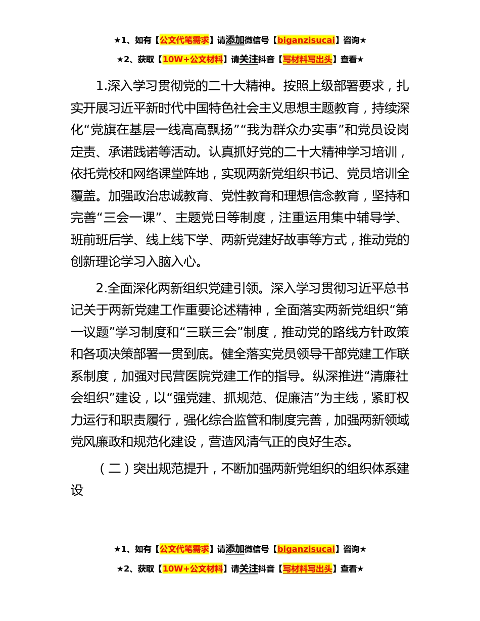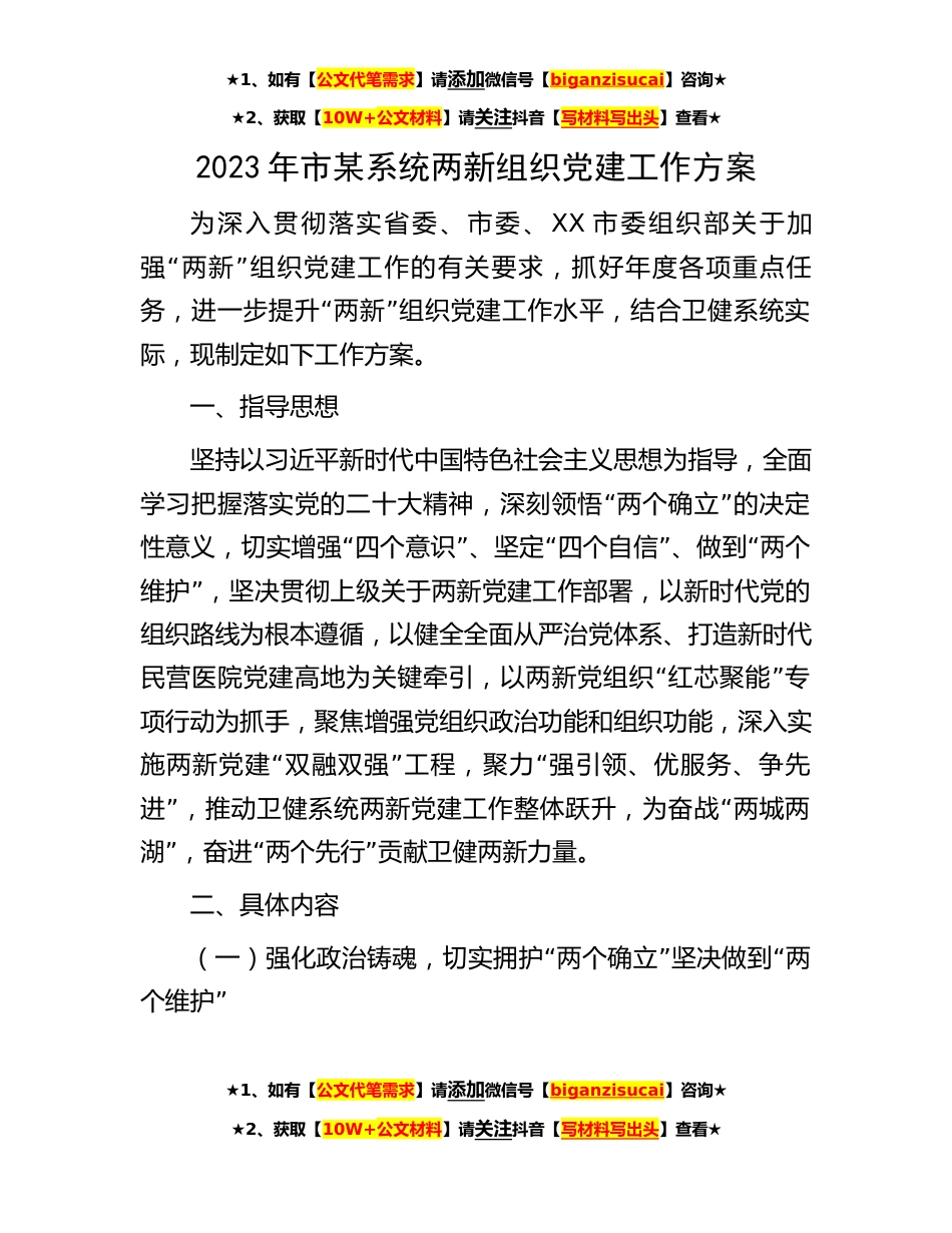 ★1、如有【公文代笔需求】请添加微信号【biganzisucai】咨询★★2、获取【10W+公文材料】请关注抖音【写材料写出头】查看★2023年市某系统两新组织党建工作方案为深入贯彻落实省委、市委、XX市委组织部关于加“”强两新组织党建工作的有关要求,抓好年度各项重点任“”务,进一步提升两新组织党建工作水平,结合卫健系统实际,现制定如下工作方案。一、指导思想坚持以习近平新时代中国特色社会主义思想为指导,全面“”学习把握落实党的二十大精神,深刻领悟两个确立的决定“”“”“性意义,切实增强四个意识、坚定四个自信、做到两个”维护,坚决贯彻上级关于两新党建工作部署,以新时代党的组织路线为根本遵循,以健全全面从严治党体系、打造新时代“”民营医院党建高地为关键牵引,以两新党组织红芯聚能专项...