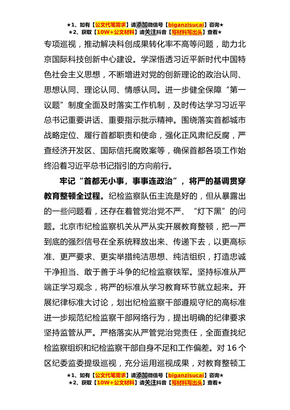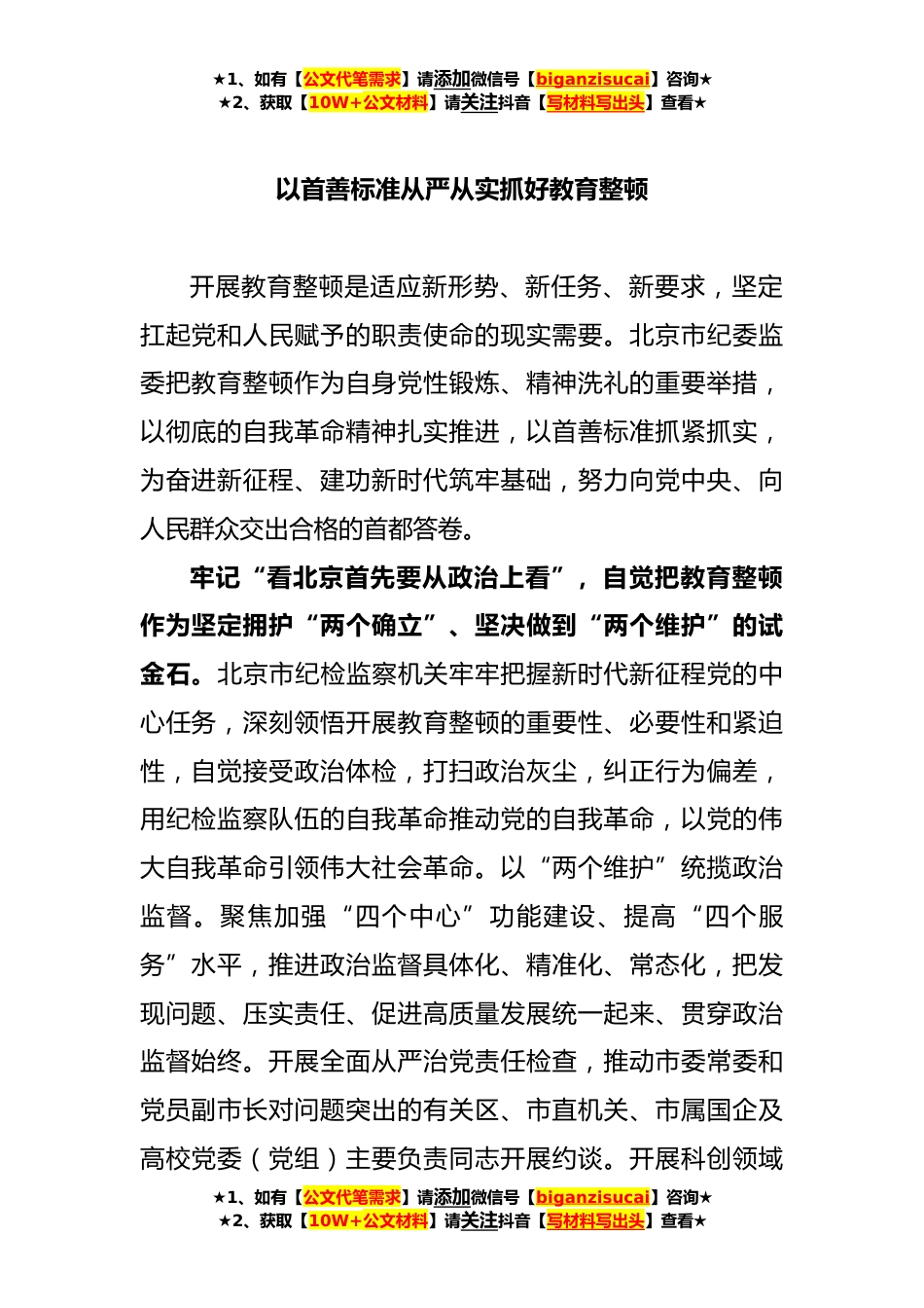★1、如有【公文代笔需求】请添加微信号【biganzisucai】咨询★★2、获取【10W+公文材料】请关注抖音【写材料写出头】查看★以首善标准从严从实抓好教育整顿开展教育整顿是适应新形势、新任务、新要求,坚定扛起党和人民赋予的职责使命的现实需要。北京市纪委监委把教育整顿作为自身党性锻炼、精神洗礼的重要举措,以彻底的自我革命精神扎实推进,以首善标准抓紧抓实,为奋进新征程、建功新时代筑牢基础,努力向党中央、向人民群众交出合格的首都答卷。牢记“看北京首先要从政治上看”,自觉把教育整顿作为坚定拥护“两个确立”、坚决做到“两个维护”的试金石。北京市纪检监察机关牢牢把握新时代新征程党的中心任务,深刻领悟开展教育整顿的重要性、必要性和紧迫性,自觉接受政治体检,打扫政治灰尘,纠正行为偏...