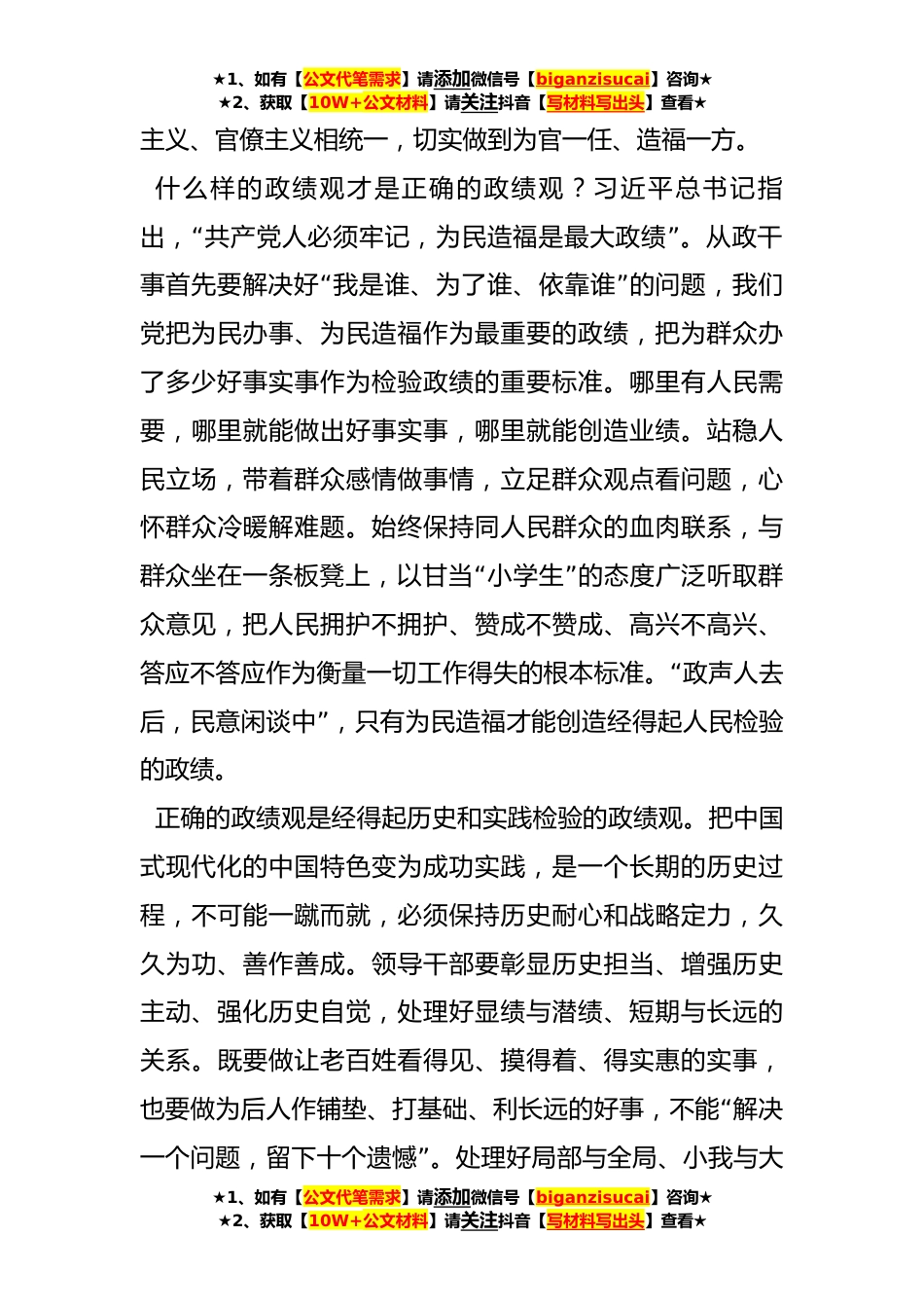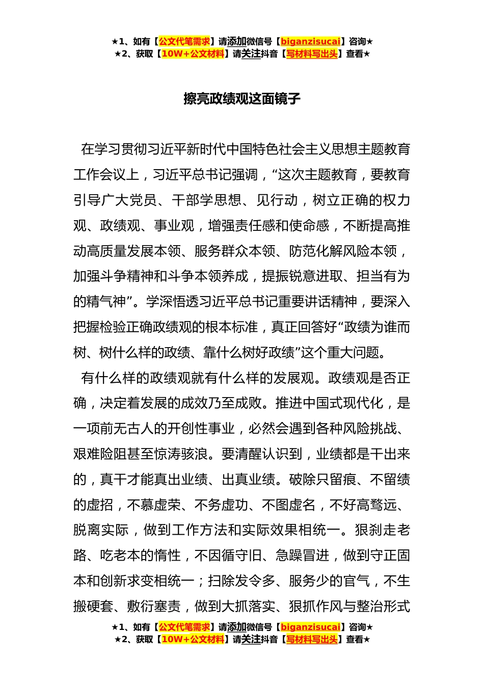★1、如有【公文代笔需求】请添加微信号【biganzisucai】咨询★★2、获取【10W+公文材料】请关注抖音【写材料写出头】查看★擦亮政绩观这面镜子在学习贯彻习近平新时代中国特色社会主义思想主题教育“工作会议上,习近平总书记强调,这次主题教育,要教育引导广大党员、干部学思想、见行动,树立正确的权力观、政绩观、事业观,增强责任感和使命感,不断提高推动高质量发展本领、服务群众本领、防范化解风险本领,加强斗争精神和斗争本领养成,提振锐意进取、担当有为”的精气神。学深悟透习近平总书记重要讲话精神,要深入“把握检验正确政绩观的根本标准,真正回答好政绩为谁而”树、树什么样的政绩、靠什么树好政绩这个重大问题。有什么样的政绩观就有什么样的发展观。政绩观是否正确,决定着发展的成效乃至成...