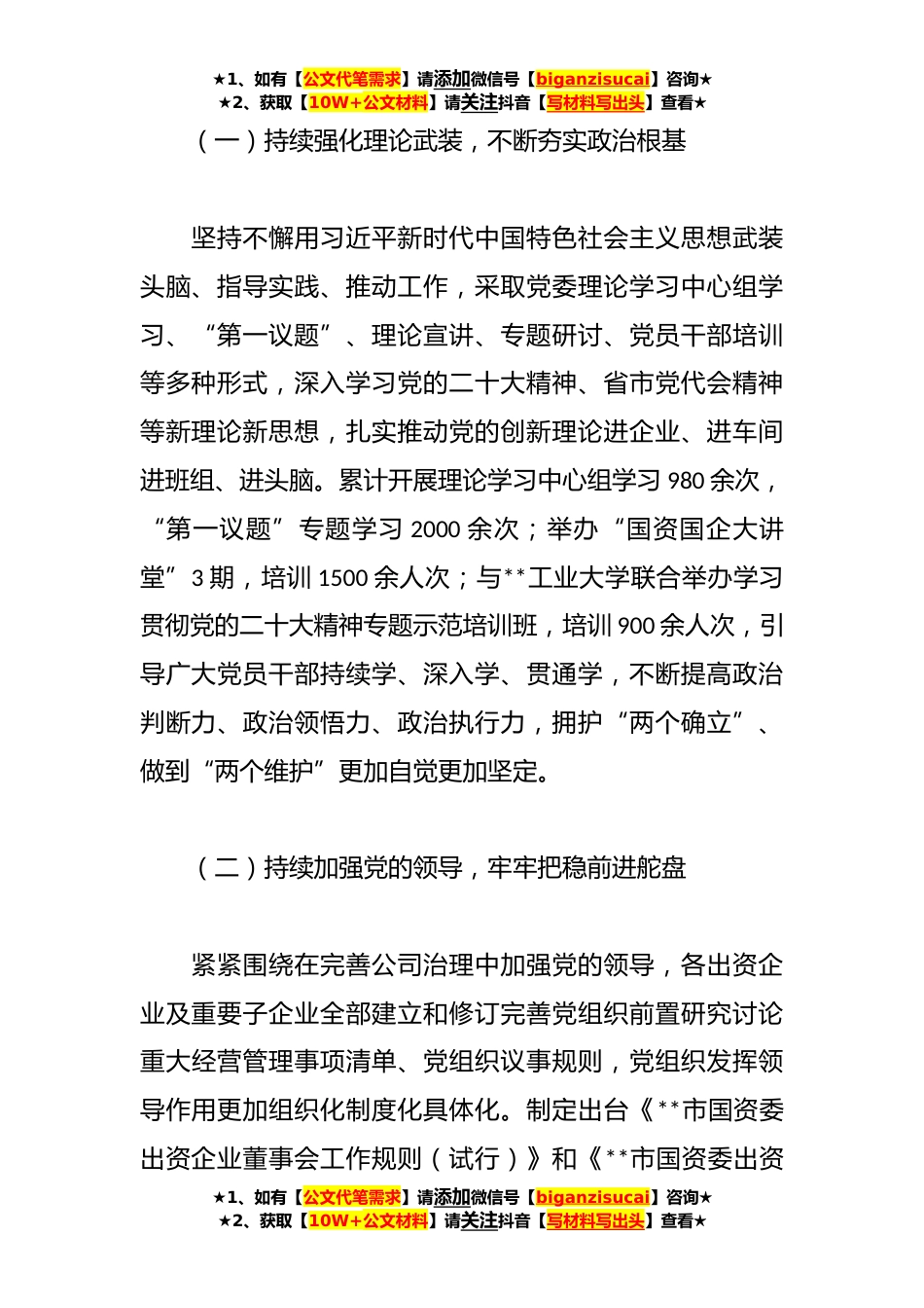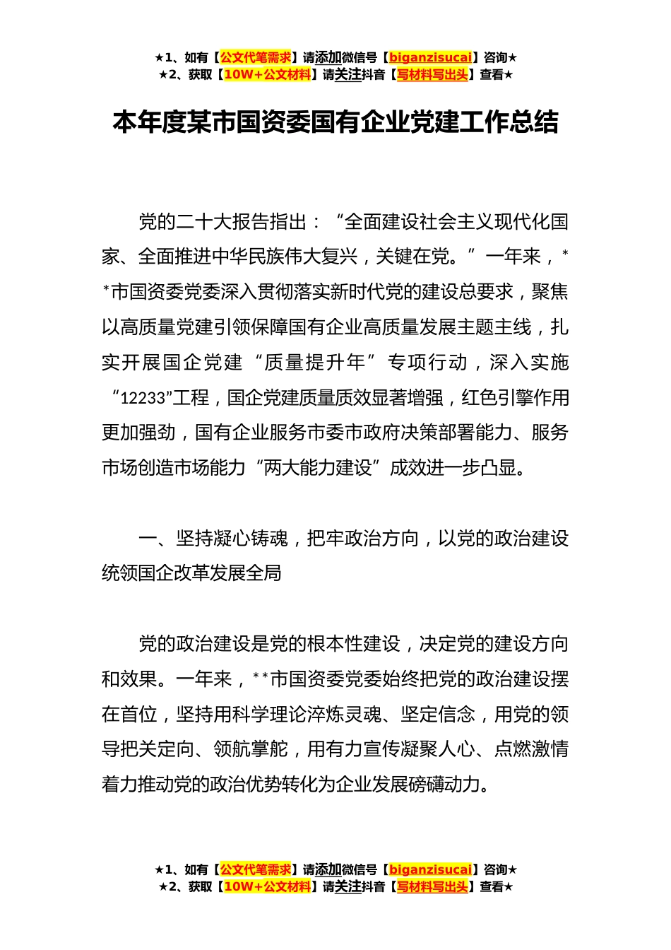 ★1、如有【公文代笔需求】请添加微信号【biganzisucai】咨询★★2、获取【10W+公文材料】请关注抖音【写材料写出头】查看★本年度某市国资委国有企业党建工作总结党的二十大报告指出:“全面建设社会主义现代化国家、全面推进中华民族伟大复兴,关键在党。”一年来,**市国资委党委深入贯彻落实新时代党的建设总要求,聚焦以高质量党建引领保障国有企业高质量发展主题主线,扎实开展国企党建“质量提升年”专项行动,深入实施“12233”工程,国企党建质量质效显著增强,红色引擎作用更加强劲,国有企业服务市委市政府决策部署能力、服务市场创造市场能力“两大能力建设”成效进一步凸显。一、坚持凝心铸魂,把牢政治方向,以党的政治建设统领国企改革发展全局党的政治建设是党的根本性建设,决定党的建设方向和效...
