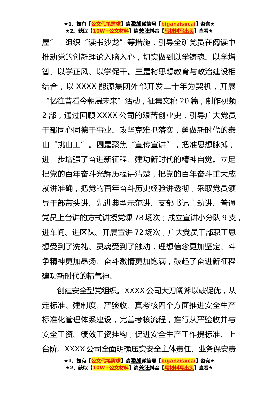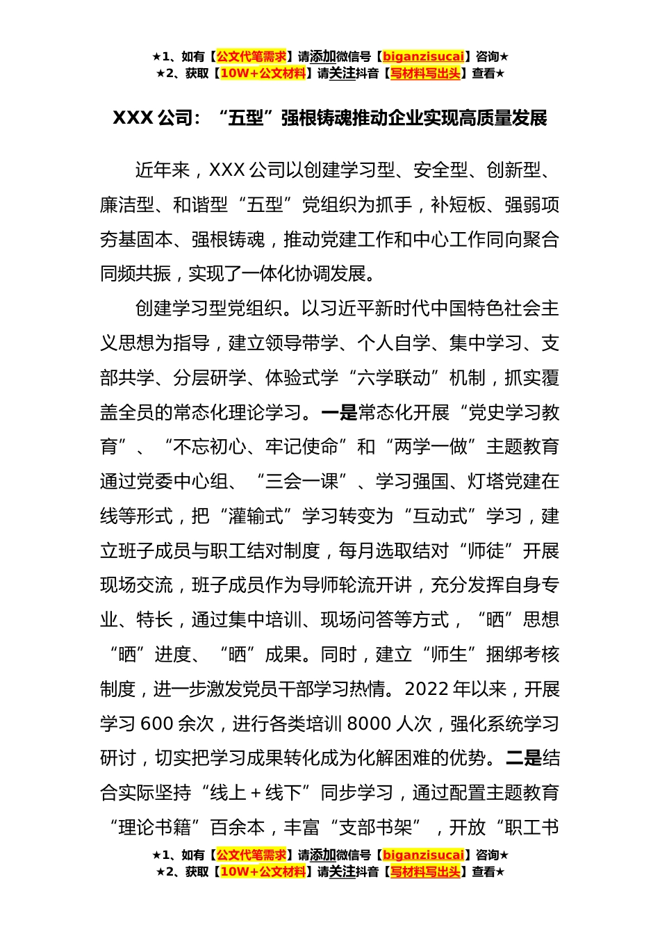 ★1、如有【公文代笔需求】请添加微信号【biganzisucai】咨询★★2、获取【10W+公文材料】请关注抖音【写材料写出头】查看★XXX公司:“五型”强根铸魂推动企业实现高质量发展近年来,XXX公司以创建学习型、安全型、创新型、廉洁型、和谐型“五型”党组织为抓手,补短板、强弱项夯基固本、强根铸魂,推动党建工作和中心工作同向聚合同频共振,实现了一体化协调发展。创建学习型党组织。以习近平新时代中国特色社会主义思想为指导,建立领导带学、个人自学、集中学习、支部共学、分层研学、体验式学“六学联动”机制,抓实覆盖全员的常态化理论学习。一是常态化开展“党史学习教育”、“不忘初心、牢记使命”和“两学一做”主题教育通过党委中心组、“三会一课”、学习强国、灯塔党建在线等形式,把“灌输式”学习...