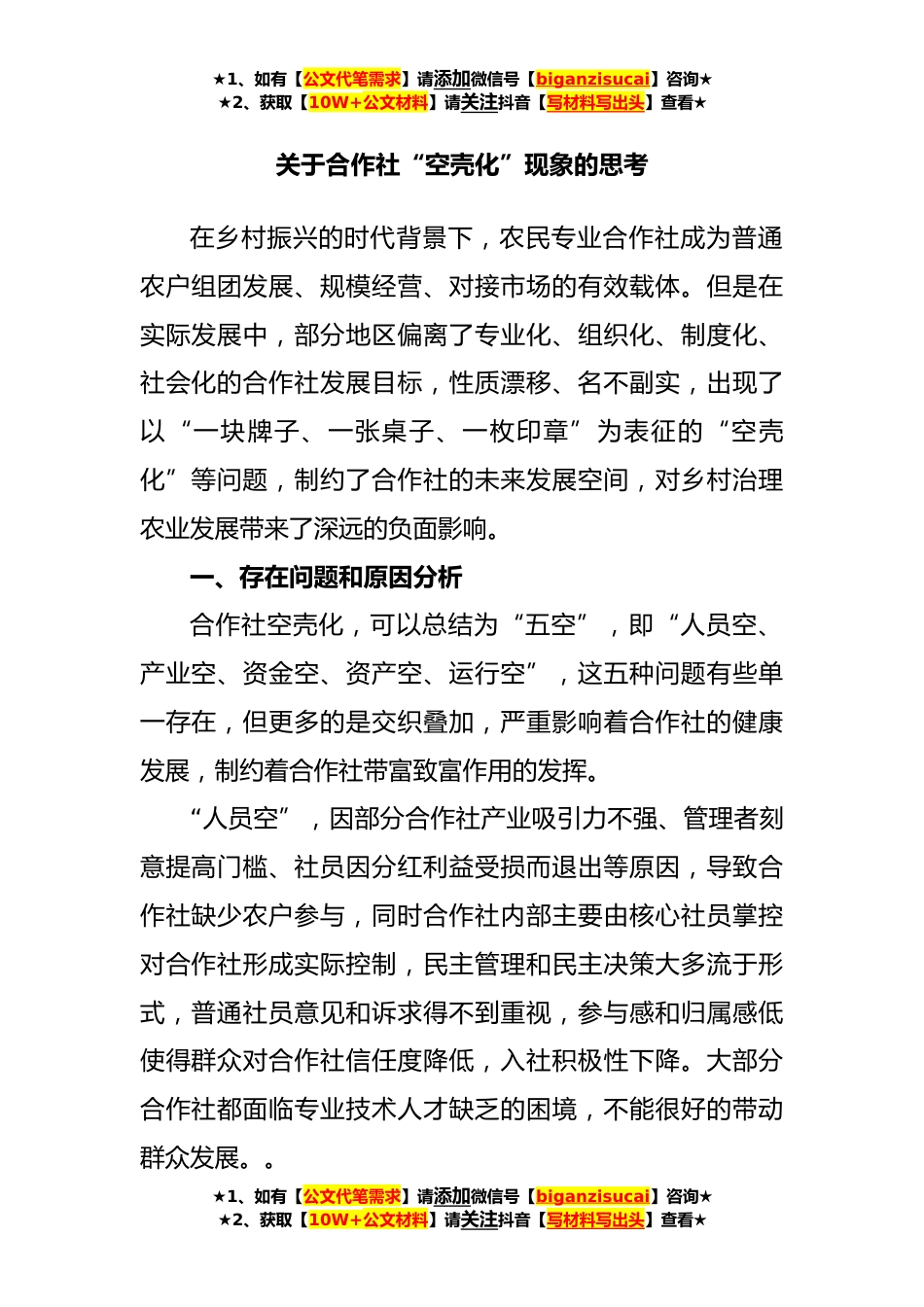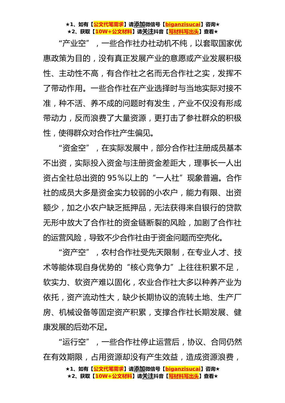 ★1、如有【公文代笔需求】请添加微信号【biganzisucai】咨询★★2、获取【10W+公文材料】请关注抖音【写材料写出头】查看★关于合作社“空壳化”现象的思考在乡村振兴的时代背景下,农民专业合作社成为普通农户组团发展、规模经营、对接市场的有效载体。但是在实际发展中,部分地区偏离了专业化、组织化、制度化、社会化的合作社发展目标,性质漂移、名不副实,出现了以“一块牌子、一张桌子、一枚印章”为表征的“空壳化”等问题,制约了合作社的未来发展空间,对乡村治理农业发展带来了深远的负面影响。一、存在问题和原因分析合作社空壳化,可以总结为“五空”,即“人员空、产业空、资金空、资产空、运行空”,这五种问题有些单一存在,但更多的是交织叠加,严重影响着合作社的健康发展,制约着合作社带富致...
