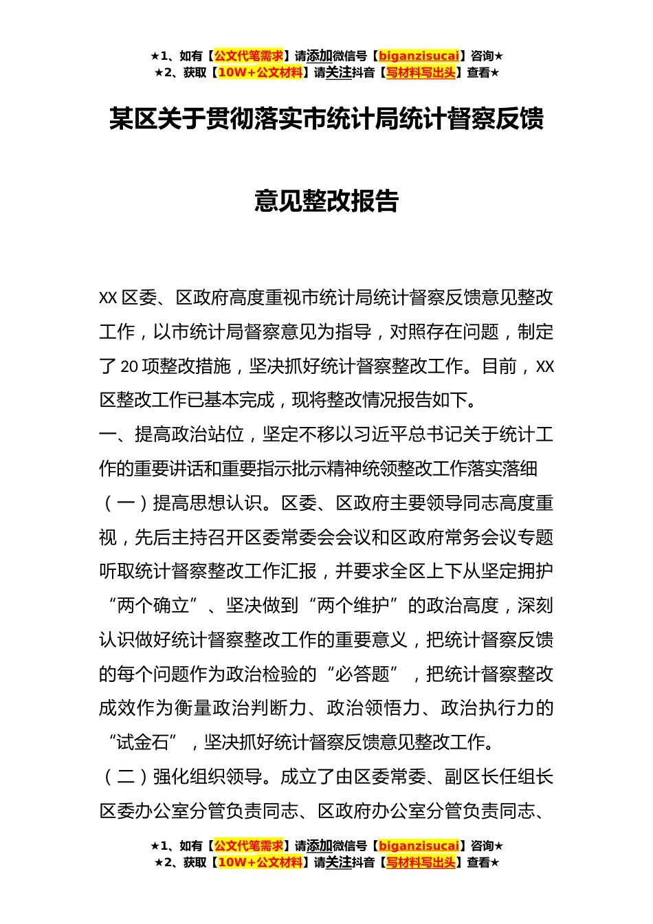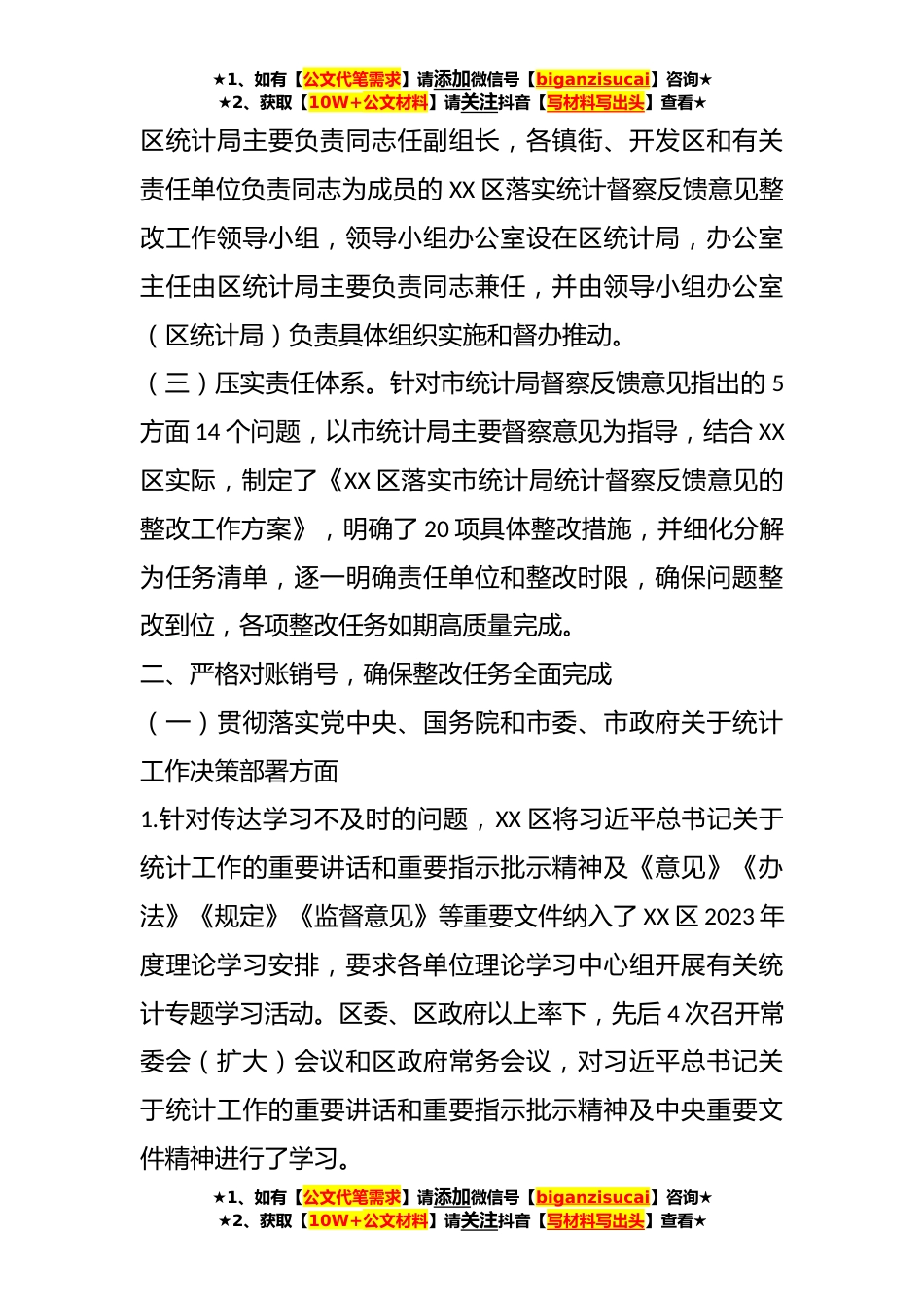 ★1、如有【公文代笔需求】请添加微信号【biganzisucai】咨询★★2、获取【10W+公文材料】请关注抖音【写材料写出头】查看★某区关于贯彻落实市统计局统计督察反馈意见整改报告XX区委、区政府高度重视市统计局统计督察反馈意见整改工作,以市统计局督察意见为指导,对照存在问题,制定了20项整改措施,坚决抓好统计督察整改工作。目前,XX区整改工作已基本完成,现将整改情况报告如下。一、提高政治站位,坚定不移以习近平总书记关于统计工作的重要讲话和重要指示批示精神统领整改工作落实落细(一)提高思想认识。区委、区政府主要领导同志高度重视,先后主持召开区委常委会会议和区政府常务会议专题听取统计督察整改工作汇报,并要求全区上下从坚定拥护“两个确立”、坚决做到“两个维护”的政治高度,深刻认识...