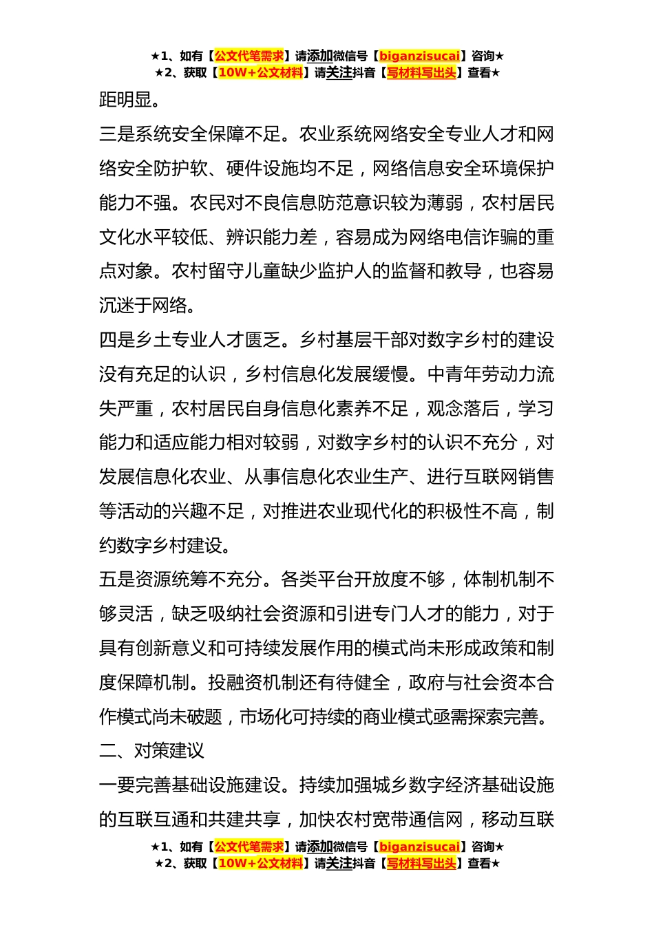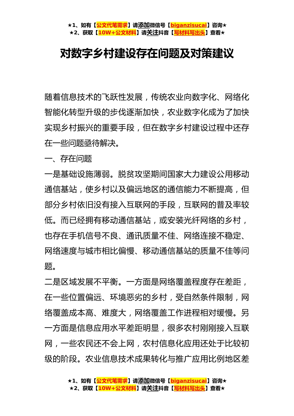 ★1、如有【公文代笔需求】请添加微信号【biganzisucai】咨询★★2、获取【10W+公文材料】请关注抖音【写材料写出头】查看★对数字乡村建设存在问题及对策建议随着信息技术的飞跃性发展,传统农业向数字化、网络化智能化转型升级的步伐逐渐加快,农业数字化成为了加快实现乡村振兴的重要手段,但在数字乡村建设过程中还存在一些问题亟待解决。一、存在问题一是基础设施薄弱。脱贫攻坚期间国家大力建设公用移动通信基站,使乡村以及偏远地区的通信能力不断提高,但部分乡村依旧没有接入互联网的手段,互联网的普及率较低。而已经拥有移动通信基站,或安装光纤网络的乡村,也存在手机信号不良、通讯质量不佳、网络连接不稳定、网络速度与城市相比偏慢、移动通信基站的质量不佳等问题。二是区域发展不平衡。一方面是...