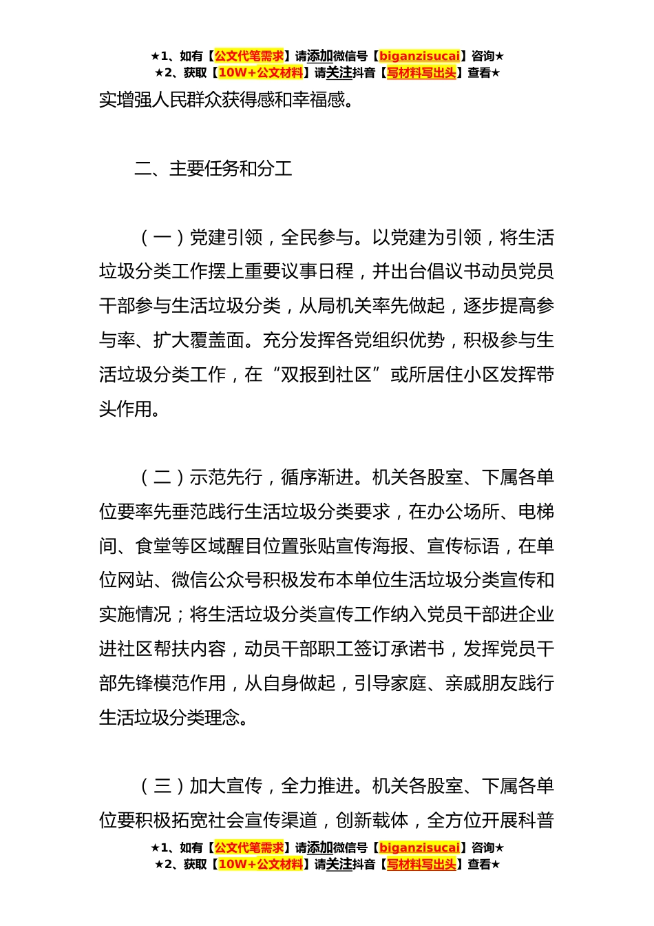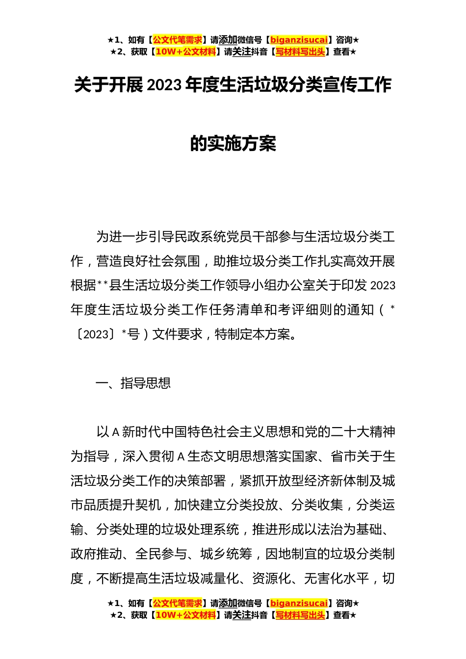 ★1、如有【公文代笔需求】请添加微信号【biganzisucai】咨询★★2、获取【10W+公文材料】请关注抖音【写材料写出头】查看★关于开展2023年度生活垃圾分类宣传工作的实施方案为进一步引导民政系统党员干部参与生活垃圾分类工作,营造良好社会氛围,助推垃圾分类工作扎实高效开展根据**县生活垃圾分类工作领导小组办公室关于印发2023年度生活垃圾分类工作任务清单和考评细则的通知(*〔2023〕*号)文件要求,特制定本方案。一、指导思想以A新时代中国特色社会主义思想和党的二十大精神为指导,深入贯彻A生态文明思想落实国家、省市关于生活垃圾分类工作的决策部署,紧抓开放型经济新体制及城市品质提升契机,加快建立分类投放、分类收集,分类运输、分类处理的垃圾处理系统,推进形成以法治为基础、政府推动、全民...