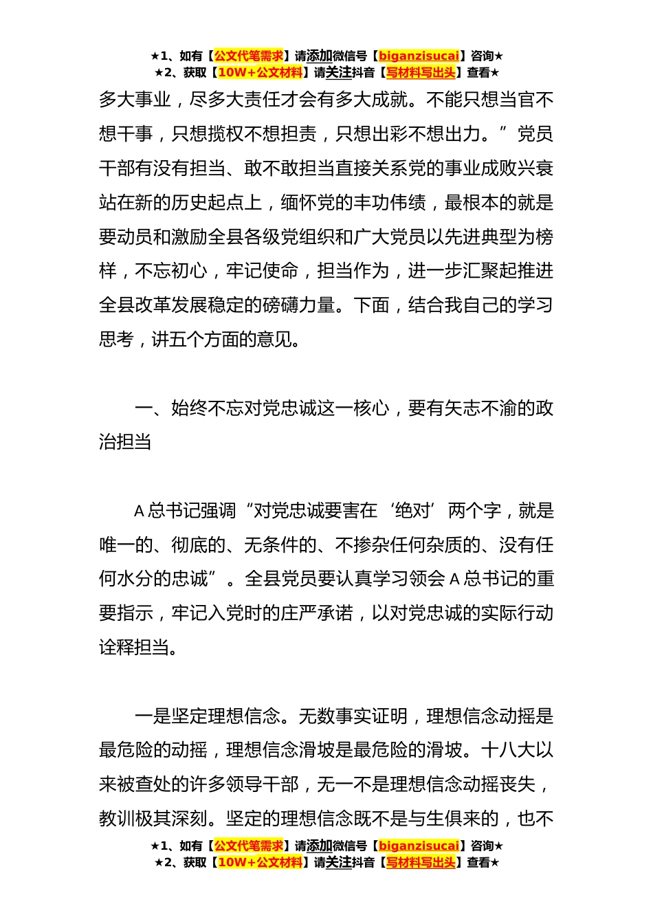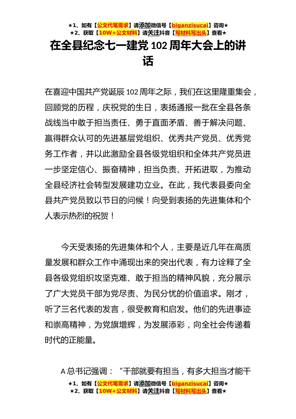 ★1、如有【公文代笔需求】请添加微信号【biganzisucai】咨询★★2、获取【10W+公文材料】请关注抖音【写材料写出头】查看★在全县纪念七一建党102周年大会上的讲话在喜迎中国共产党诞辰102周年之际,我们在这里隆重集会,回顾党的历程,庆祝党的生日,表扬通报一批在全县各条战线当中敢于担当责任、勇于直面矛盾、善于解决问题、赢得群众认可的先进基层党组织、优秀共产党员、优秀党务工作者,并以此激励全县各级党组织和全体共产党员进一步坚定信心、振奋精神,担当负责、开拓进取,为推动全县经济社会转型发展建功立业。在此,我代表县委向全县共产党员致以节日的问候!向受到表扬的先进集体和个人表示热烈的祝贺!今天受表扬的先进集体和个人,主要是近几年在高质量发展和群众工作中涌现出来的突出代表,有力...