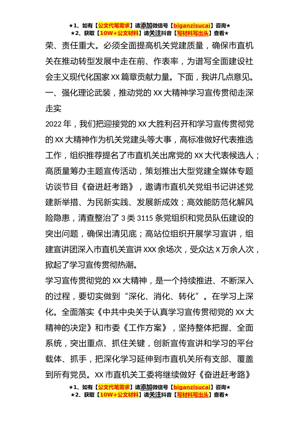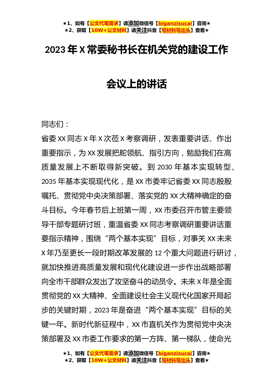 ★1、如有【公文代笔需求】请添加微信号【biganzisucai】咨询★★2、获取【10W+公文材料】请关注抖音【写材料写出头】查看★2023年X常委秘书长在机关党的建设工作会议上的讲话同志们:省委XX同志X年X次莅X考察调研,发表重要讲话、作出重要指示,为XX发展把舵领航、指引方向,勉励我们在高质量发展上不断取得新突破。到2030年基本实现转型、2035年基本实现现代化,是XX市委牢记省委XX同志殷殷嘱托、贯彻党中央决策部署、落实党的XX大精神确定的奋斗目标。今年春节后上班第一周,XX市委召开市管主要领导干部专题研讨班,重温省委XX同志考察调研重要讲话重要指示精神,围绕“两个基本实现”目标,对事关XX未来X年乃至更长一段时期改革发展的12个重大问题进行研讨,就加快推进高质量发展和现代化建设进一步作出战略部...