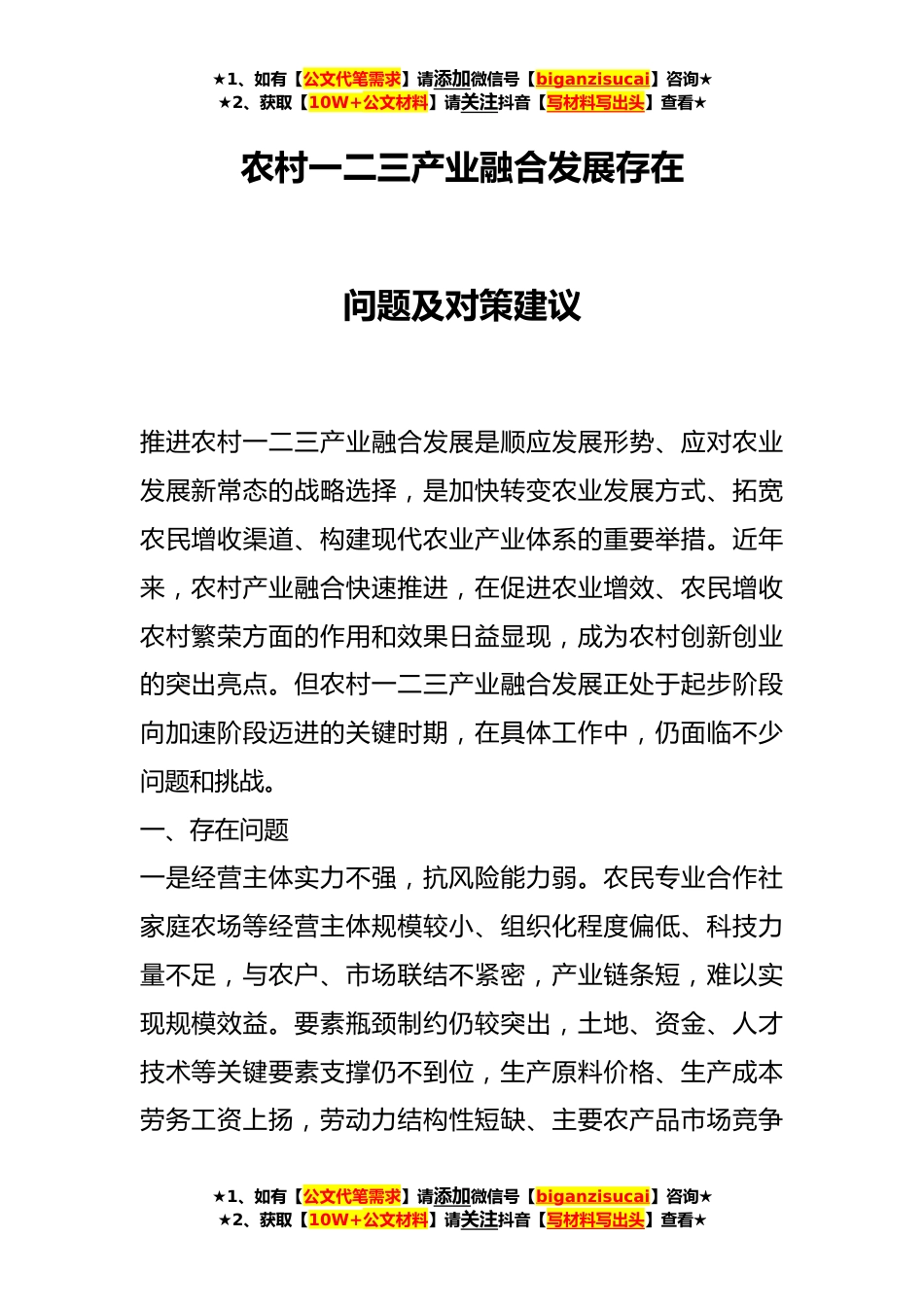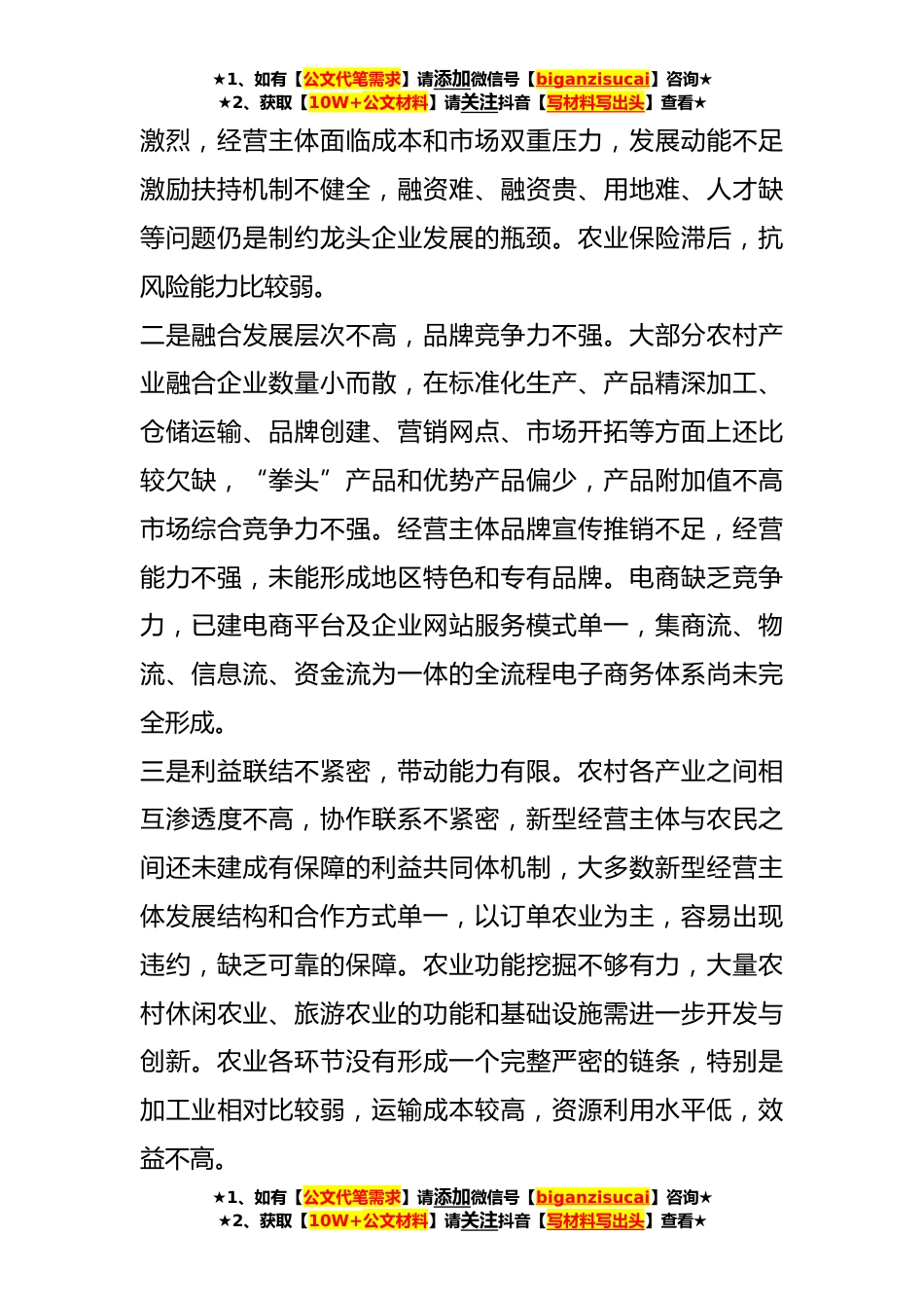 ★1、如有【公文代笔需求】请添加微信号【biganzisucai】咨询★★2、获取【10W+公文材料】请关注抖音【写材料写出头】查看★农村一二三产业融合发展存在问题及对策建议推进农村一二三产业融合发展是顺应发展形势、应对农业发展新常态的战略选择,是加快转变农业发展方式、拓宽农民增收渠道、构建现代农业产业体系的重要举措。近年来,农村产业融合快速推进,在促进农业增效、农民增收农村繁荣方面的作用和效果日益显现,成为农村创新创业的突出亮点。但农村一二三产业融合发展正处于起步阶段向加速阶段迈进的关键时期,在具体工作中,仍面临不少问题和挑战。一、存在问题一是经营主体实力不强,抗风险能力弱。农民专业合作社家庭农场等经营主体规模较小、组织化程度偏低、科技力量不足,与农户、市场联结不紧密,...