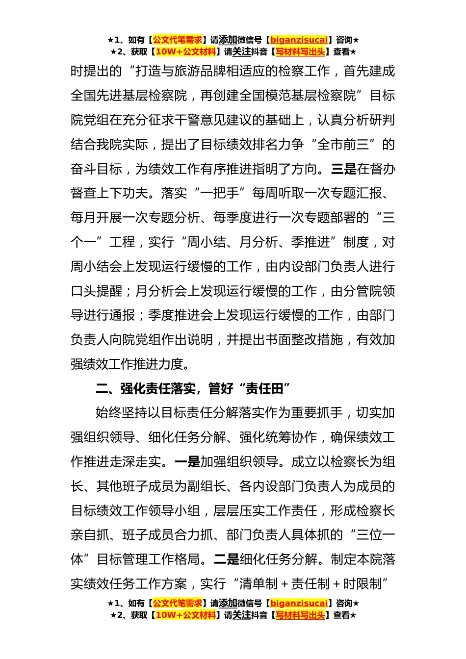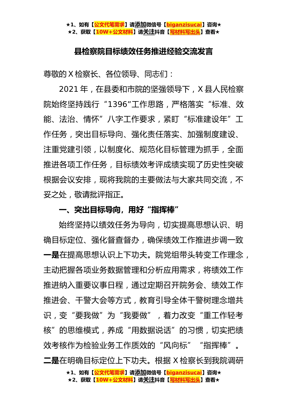 ★1、如有【公文代笔需求】请添加微信号【biganzisucai】咨询★★2、获取【10W+公文材料】请关注抖音【写材料写出头】查看★县检察院目标绩效任务推进经验交流发言尊敬的X检察长、各位领导、同志们:2021年,在县委和市院的坚强领导下,X县人民检察院始终坚持践行“1396”工作思路,严格落实“标准、效能、法治、情怀”八字工作要求,紧盯“标准建设年”工作任务,突出目标导向、强化责任落实、加强制度建设、注重党建引领,以制度化、规范化目标管理为抓手,全面推进各项工作任务,目标绩效考评成绩实现了历史性突破根据会议安排,现将我院的主要做法与大家共同交流,不妥之处,敬请批评指正。一、突出目标导向,用好“指挥棒”始终坚持以绩效任务为导向,切实提高思想认识、明确目标定位、强化督查督办,确保绩...