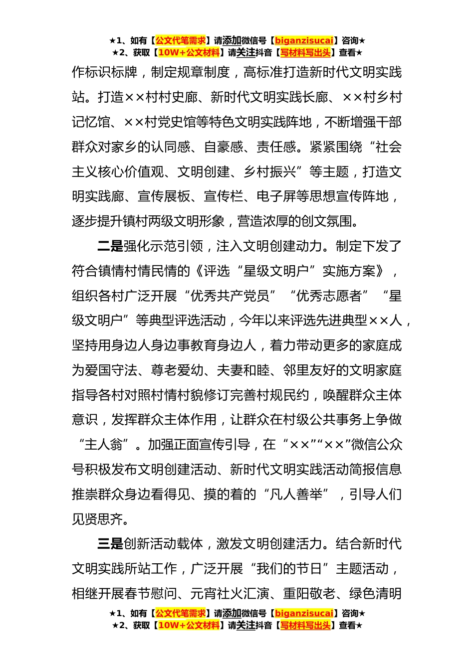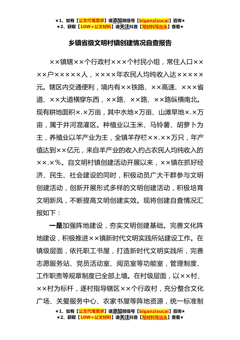 ★1、如有【公文代笔需求】请添加微信号【biganzisucai】咨询★★2、获取【10W+公文材料】请关注抖音【写材料写出头】查看★乡镇省级文明村镇创建情况自查报告××镇辖××个行政村×××个村民小组,常住人口××××户×××××人,××××年农民人均纯收入达×××××元。辖区内交通便利,境内有××铁路、××高速、×××省道、××大道横穿东西,××路、××路、××路纵横南北。现有耕地面积×.×万亩,其中水地×万亩、山滩旱地×.×万亩,属于井河混灌区。种植业以玉米、马铃薯、胡萝卜为主,养殖业以羊产业为主,全镇羊存栏××.××万只,年产值达到××亿元,来自羊产业的收入约占农民人均纯收入的××.×%。自文明村镇创建活动开展以来,××镇在抓好经济、民生、社会建设的同时,积极动员广大...