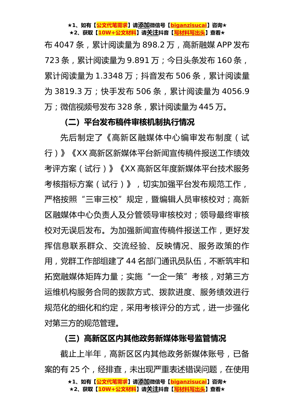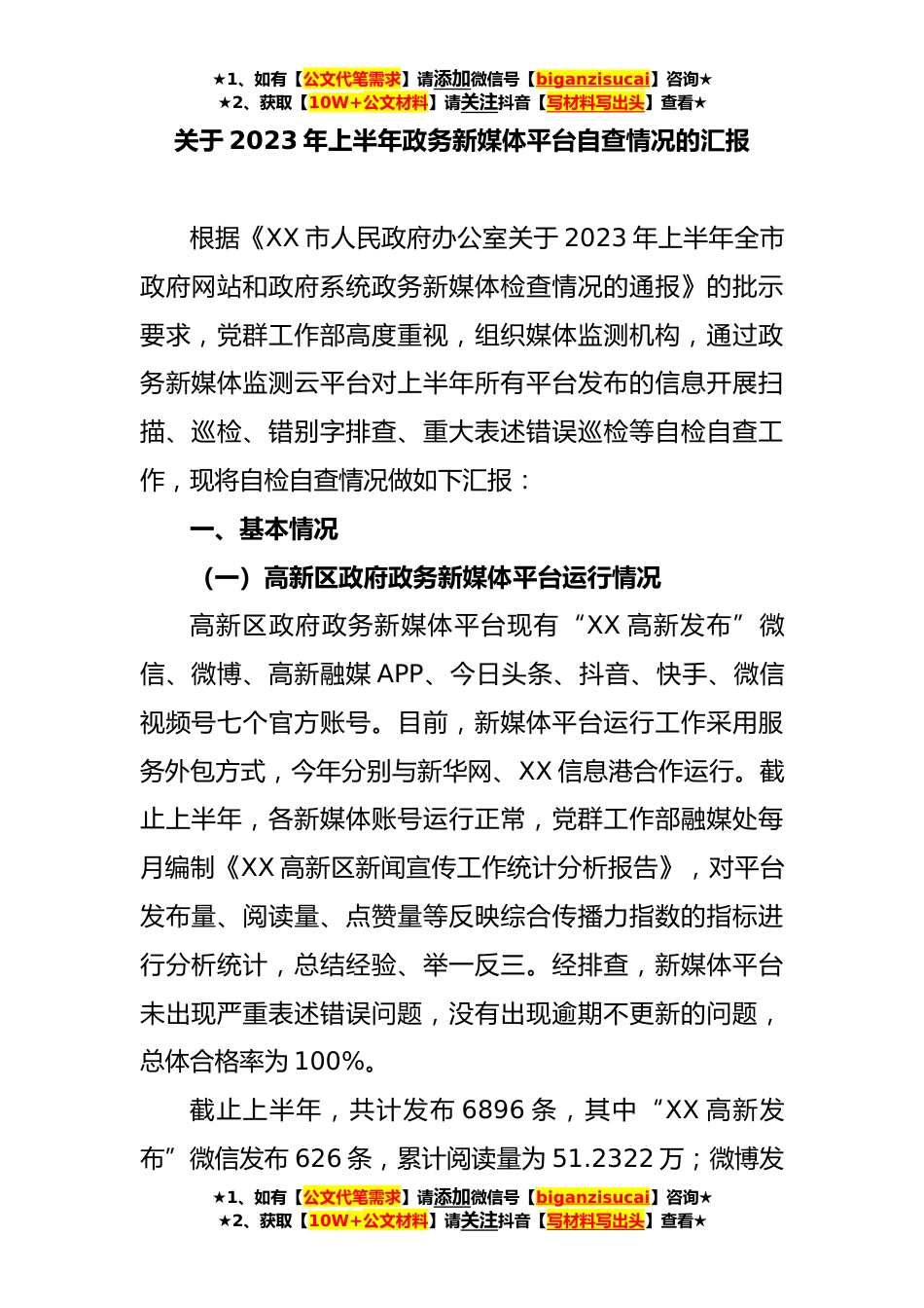★1、如有【公文代笔需求】请添加微信号【biganzisucai】咨询★★2、获取【10W+公文材料】请关注抖音【写材料写出头】查看★关于2023年上半年政务新媒体平台自查情况的汇报根据《XX市人民政府办公室关于2023年上半年全市政府网站和政府系统政务新媒体检查情况的通报》的批示要求,党群工作部高度重视,组织媒体监测机构,通过政务新媒体监测云平台对上半年所有平台发布的信息开展扫描、巡检、错别字排查、重大表述错误巡检等自检自查工作,现将自检自查情况做如下汇报:一、基本情况(一)高新区政府政务新媒体平台运行情况高新区政府政务新媒体平台现有“XX高新发布”微信、微博、高新融媒APP、今日头条、抖音、快手、微信视频号七个官方账号。目前,新媒体平台运行工作采用服务外包方式,今年分别与新华网、XX信...