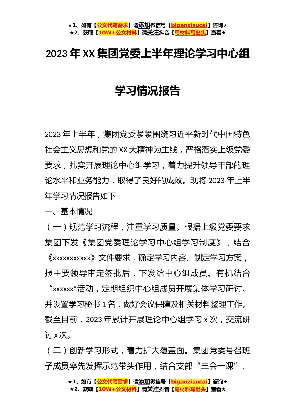 ★1、如有【公文代笔需求】请添加微信号【biganzisucai】咨询★★2、获取【10W+公文材料】请关注抖音【写材料写出头】查看★2023年XX集团党委上半年理论学习中心组学习情况报告2023年上半年,集团党委紧紧围绕习近平新时代中国特色社会主义思想和党的XX大精神为主线,严格落实上级党委要求,扎实开展理论中心组学习,着力提升领导干部的理论水平和业务能力,取得了良好的成效。现将2023年上半年学习情况报告如下:一、基本情况(一)规范学习流程,注重学习质量。根据上级党委要求集团下发《集团党委理论学习中心组学习制度》,结合《xxxxxxxxxxx》文件要求,确定学习内容、制定学习方案,报主要领导审定签批后,下发给中心组成员。有机结合“xxxxxx”活动,定期组织中心组成员开展集体学习研讨。并设置学习秘书1...