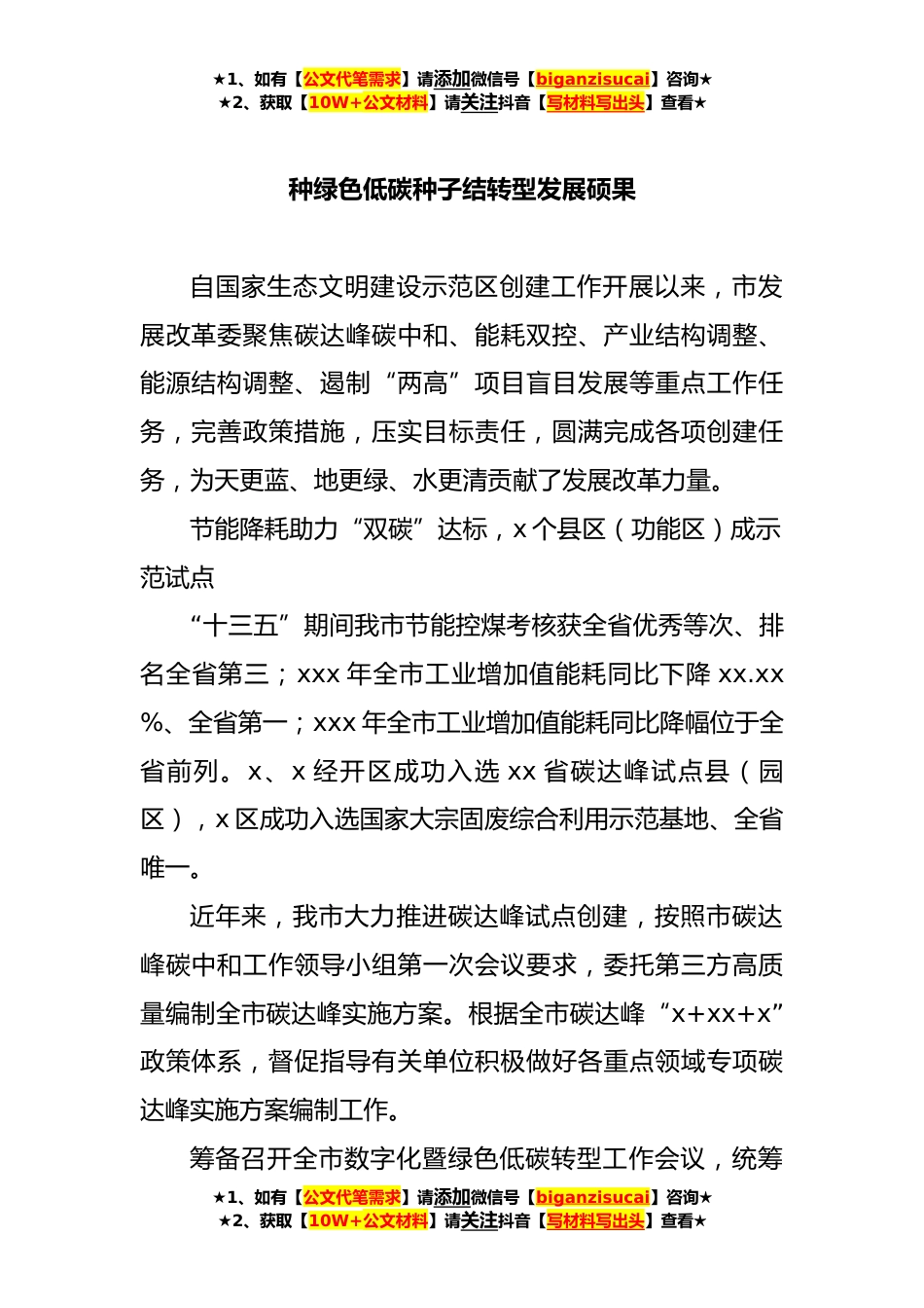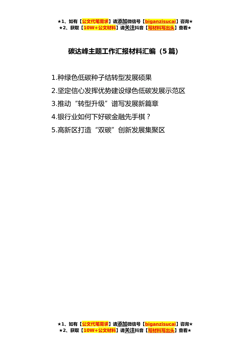 ★1、如有【公文代笔需求】请添加微信号【biganzisucai】咨询★★2、获取【10W+公文材料】请关注抖音【写材料写出头】查看★碳达峰主题工作汇报材料汇编(5篇)1.种绿色低碳种子结转型发展硕果2.坚定信心发挥优势建设绿色低碳发展示范区3.推动“转型升级”谱写发展新篇章4.银行业如何下好碳金融先手棋?5.高新区打造“双碳”创新发展集聚区★1、如有【公文代笔需求】请添加微信号【biganzisucai】咨询★★2、获取【10W+公文材料】请关注抖音【写材料写出头】查看★★1、如有【公文代笔需求】请添加微信号【biganzisucai】咨询★★2、获取【10W+公文材料】请关注抖音【写材料写出头】查看★种绿色低碳种子结转型发展硕果自国家生态文明建设示范区创建工作开展以来,市发展改革委聚焦碳达峰碳中和、能耗双控、产业结...