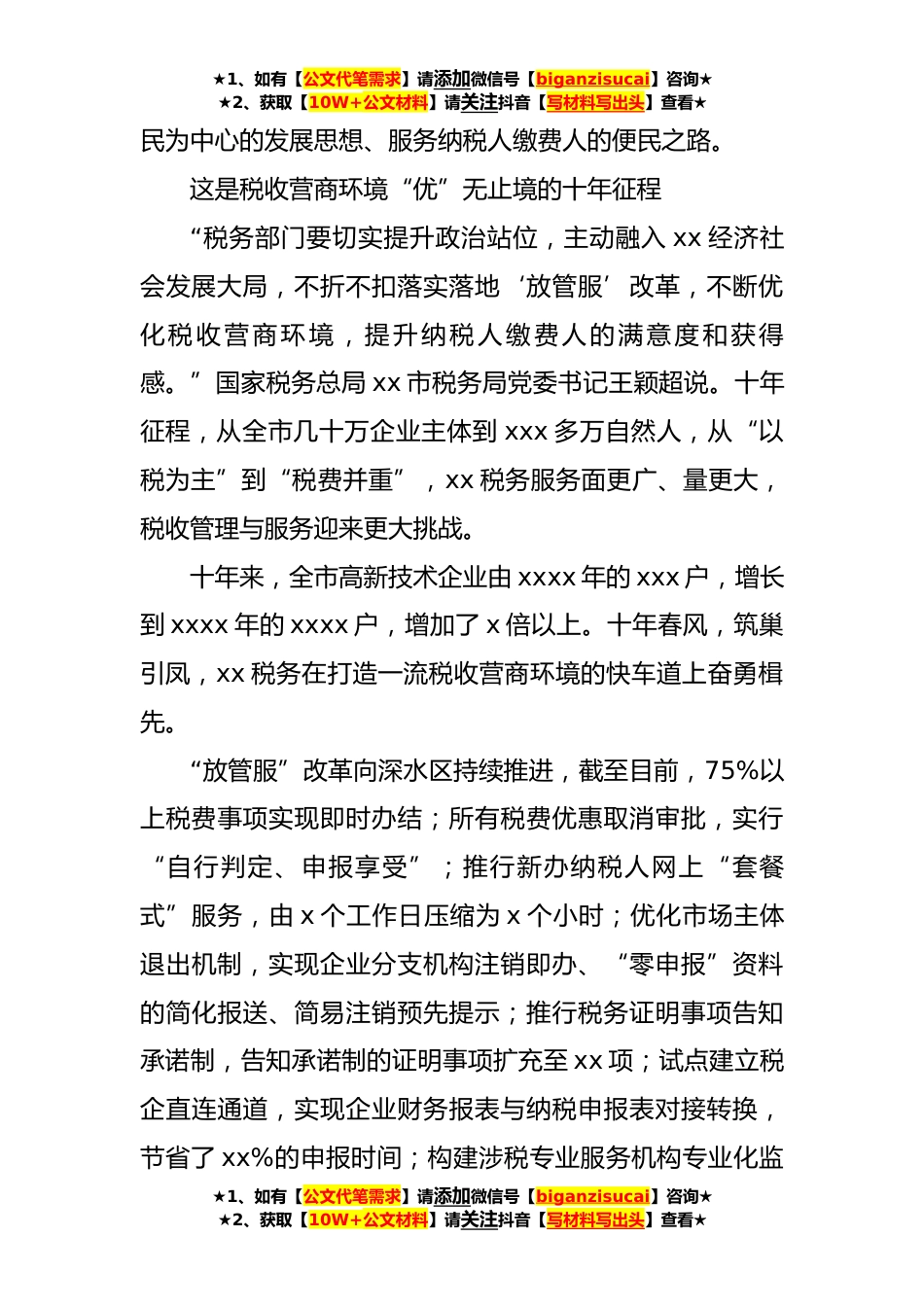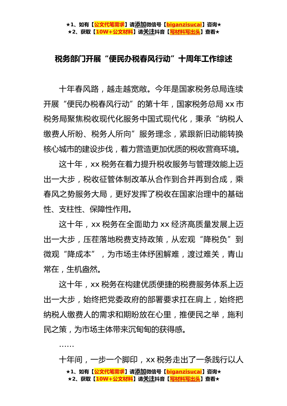★1、如有【公文代笔需求】请添加微信号【biganzisucai】咨询★★2、获取【10W+公文材料】请关注抖音【写材料写出头】查看★税务部门开展“便民办税春风行动”十周年工作综述十年春风路,越走越宽敞。今年是国家税务总局连续开展“便民办税春风行动”的第十年,国家税务总局xx市税务局聚焦税收现代化服务中国式现代化,秉承“纳税人缴费人所盼、税务人所向”服务理念,紧跟新旧动能转换核心城市的建设步伐,着力营造更加优质的税收营商环境。这十年,xx税务在着力提升税收服务与管理效能上迈出一大步,税收征管体制改革从合作到合并再到合成,乘春风之势服务大局,更好发挥了税收在国家治理中的基础性、支柱性、保障性作用。这十年,xx税务在全面助力xx经济高质量发展上迈出一大步,压茬落地税费支持政策,从宏观...