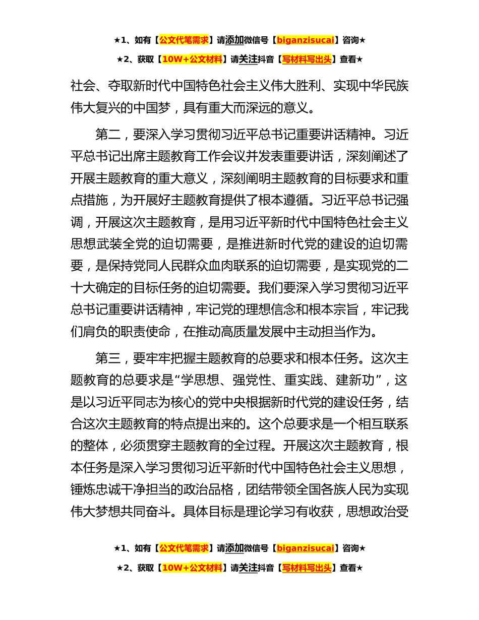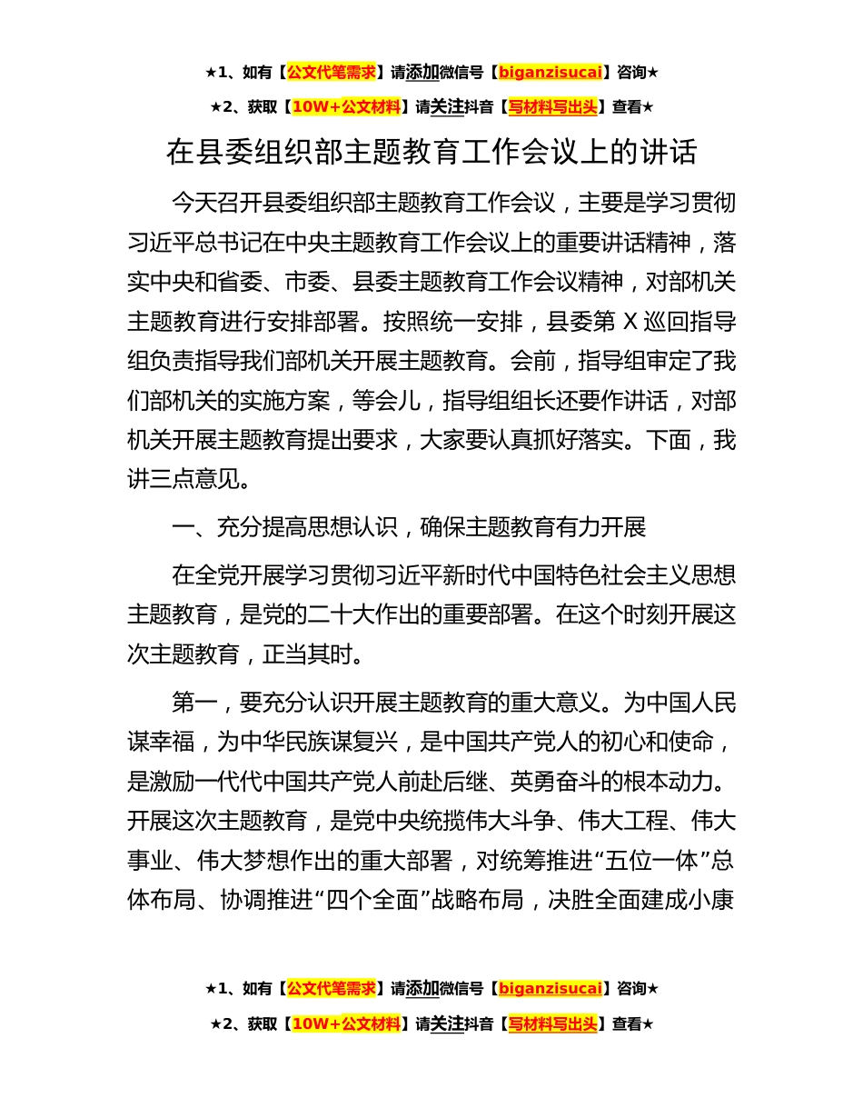 ★1、如有【公文代笔需求】请添加微信号【biganzisucai】咨询★★2、获取【10W+公文材料】请关注抖音【写材料写出头】查看★在县委组织部主题教育工作会议上的讲话今天召开县委组织部主题教育工作会议,主要是学习贯彻习近平总书记在中央主题教育工作会议上的重要讲话精神,落实中央和省委、市委、县委主题教育工作会议精神,对部机关主题教育进行安排部署。按照统一安排,县委第X巡回指导组负责指导我们部机关开展主题教育。会前,指导组审定了我们部机关的实施方案,等会儿,指导组组长还要作讲话,对部机关开展主题教育提出要求,大家要认真抓好落实。下面,我讲三点意见。一、充分提高思想认识,确保主题教育有力开展在全党开展学习贯彻习近平新时代中国特色社会主义思想主题教育,是党的二十大作出的重要部署...