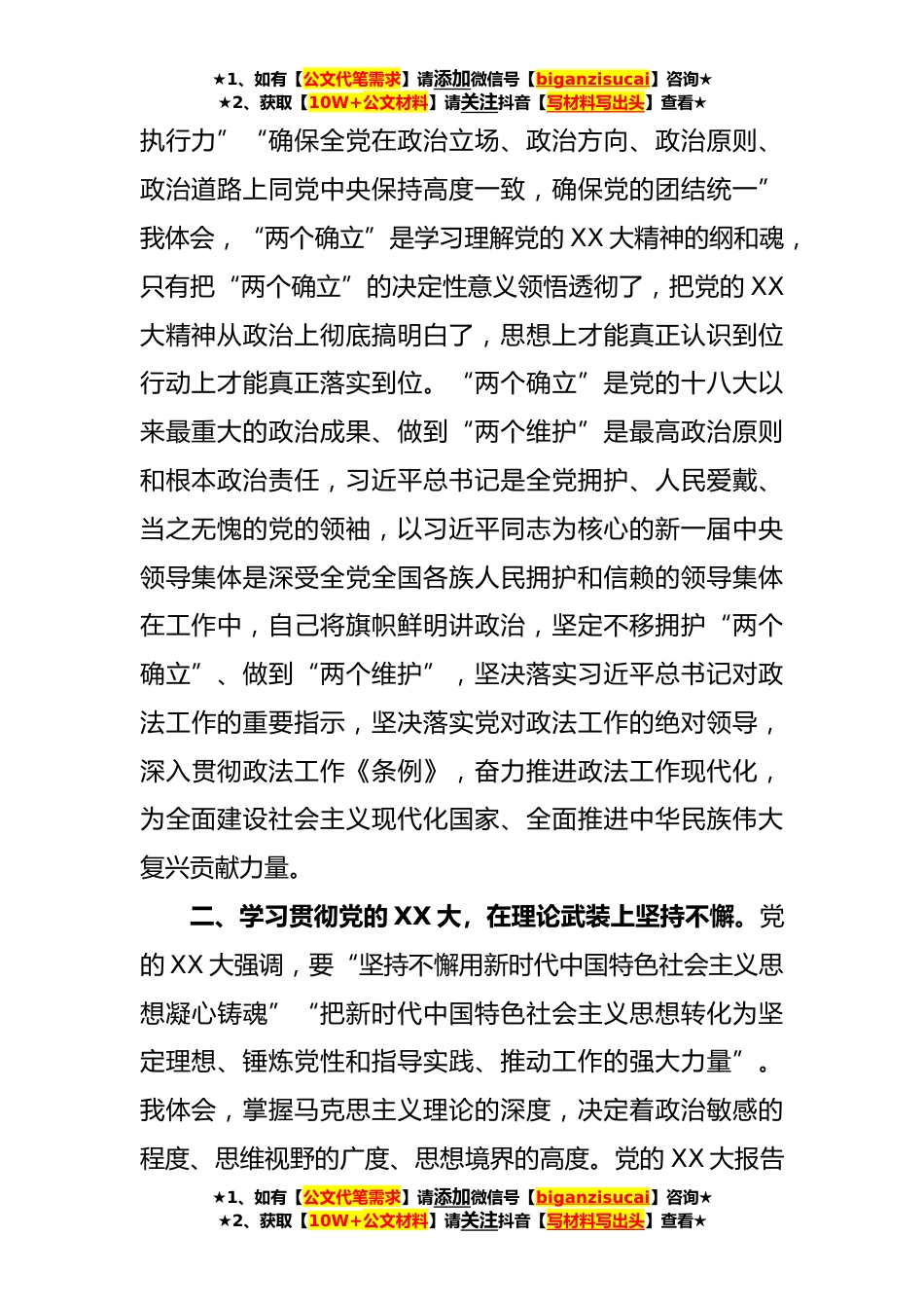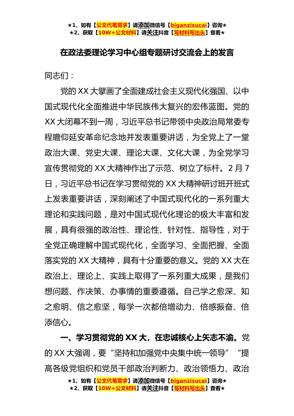 ★1、如有【公文代笔需求】请添加微信号【biganzisucai】咨询★★2、获取【10W+公文材料】请关注抖音【写材料写出头】查看★在政法委理论学习中心组专题研讨交流会上的发言同志们:党的XX大擘画了全面建成社会主义现代化强国、以中国式现代化全面推进中华民族伟大复兴的宏伟蓝图。党的XX大闭幕不到一周,习近平总书记带领中央政治局常委专程瞻仰延安革命纪念地并发表重要讲话,为全党上了一堂政治大课、党史大课、理论大课、文化大课,为全党学习宣传贯彻党的XX大精神作出了示范、树立了标杆。2月7日,习近平总书记在学习贯彻党的XX大精神研讨班开班式上发表重要讲话,深刻阐述了中国式现代化的一系列重大理论和实践问题,是对中国式现代化理论的极大丰富和发展,具有很强的政治性、理论性、针对性、指导性,对于...