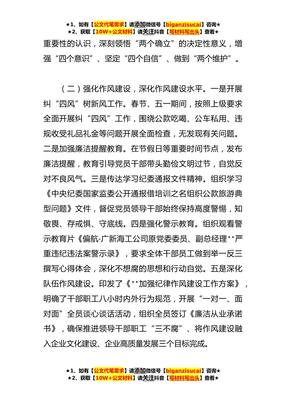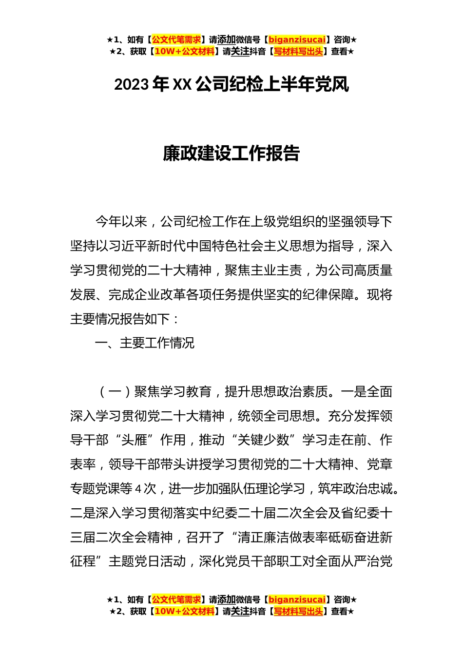★1、如有【公文代笔需求】请添加微信号【biganzisucai】咨询★★2、获取【10W+公文材料】请关注抖音【写材料写出头】查看★2023年XX公司纪检上半年党风廉政建设工作报告今年以来,公司纪检工作在上级党组织的坚强领导下坚持以习近平新时代中国特色社会主义思想为指导,深入学习贯彻党的二十大精神,聚焦主业主责,为公司高质量发展、完成企业改革各项任务提供坚实的纪律保障。现将主要情况报告如下:一、主要工作情况(一)聚焦学习教育,提升思想政治素质。一是全面深入学习贯彻党二十大精神,统领全司思想。充分发挥领导干部“头雁”作用,推动“关键少数”学习走在前、作表率,领导干部带头讲授学习贯彻党的二十大精神、党章专题党课等4次,进一步加强队伍理论学习,筑牢政治忠诚。二是深入学习贯彻落实中纪委...