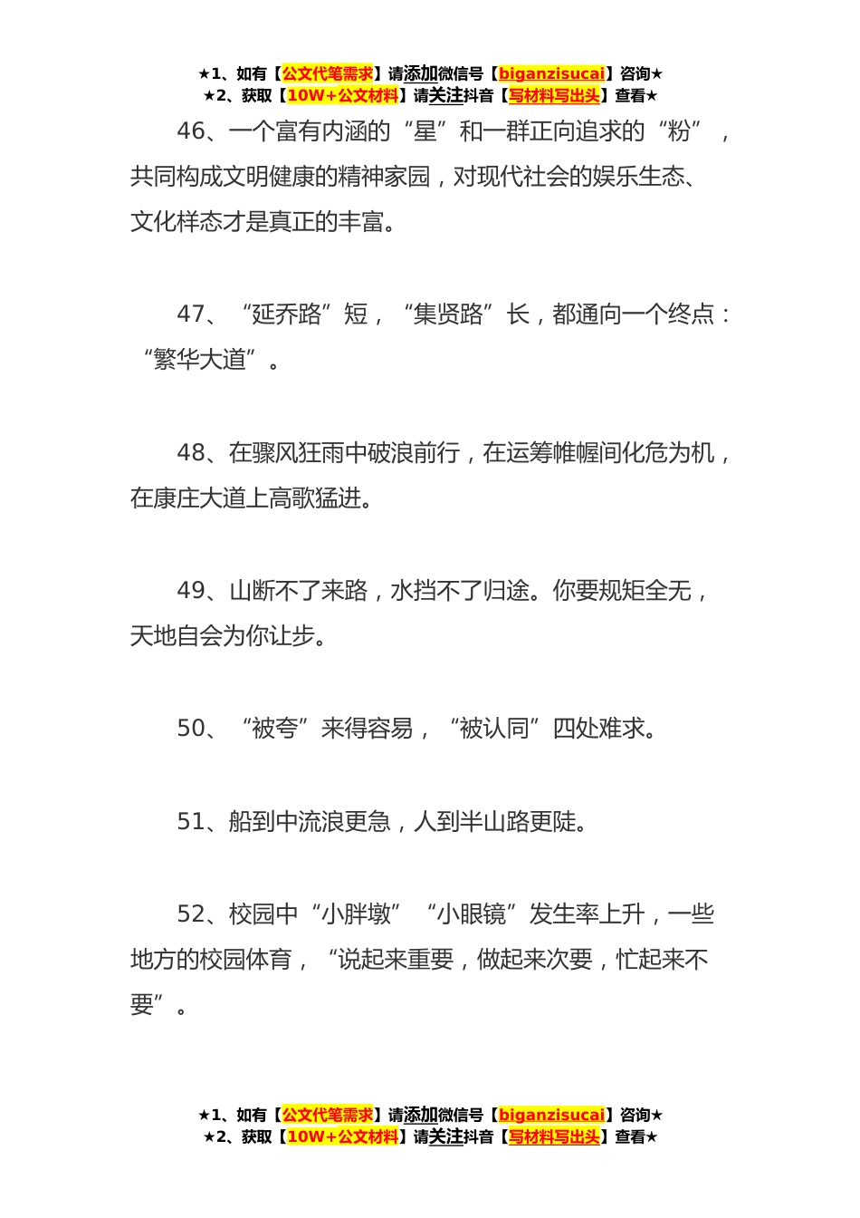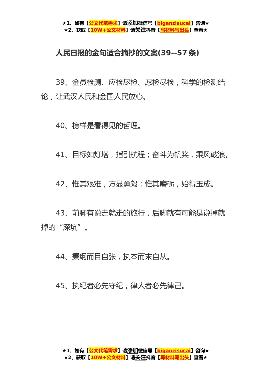 ★1、如有【公文代笔需求】请添加微信号【biganzisucai】咨询★★2、获取【10W+公文材料】请关注抖音【写材料写出头】查看★人民日报的金句适合摘抄的文案(39--57条)39、金员检测、应检尽检、愿检尽检,科学的检测结论,让武汉人民和金国人民放心。40、榜样是看得见的哲理。41、目标如灯塔,指引航程;奋斗为帆桨,乘风破浪。42、惟其艰难,方显勇毅;惟其磨砺,始得玉成。43、前脚有说走就走的旅行,后脚就有可能是说掉就掉的“深坑”。44、秉纲而目自张,执本而末自从。45、执纪者必先守纪,律人者必先律己。★1、如有【公文代笔需求】请添加微信号【biganzisucai】咨询★★2、获取【10W+公文材料】请关注抖音【写材料写出头】查看★★1、如有【公文代笔需求】请添加微信号【biganzisucai】咨询★★2、获取【10W...