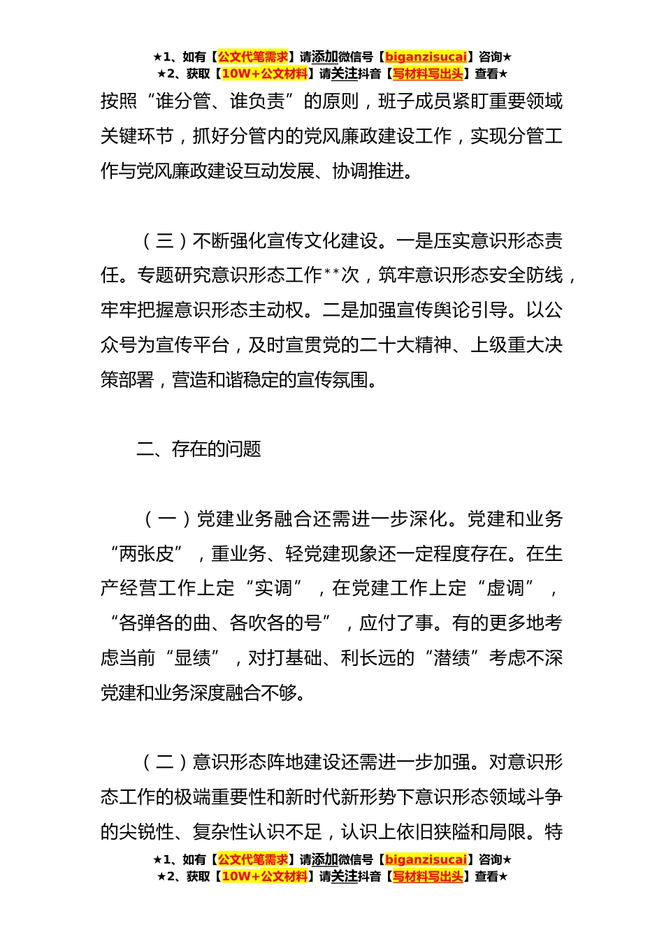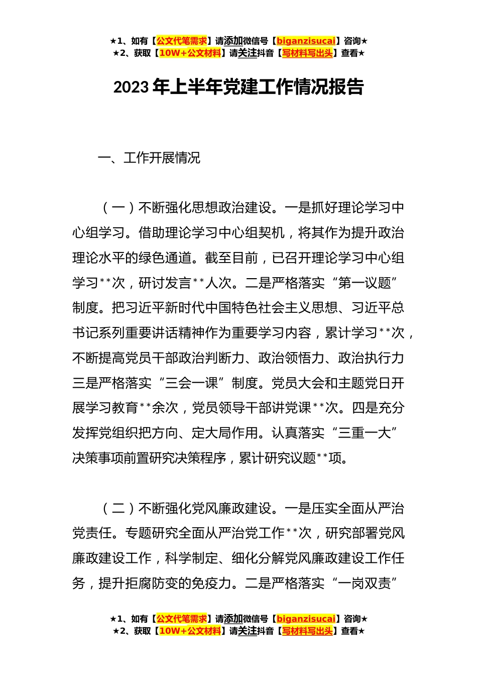 ★1、如有【公文代笔需求】请添加微信号【biganzisucai】咨询★★2、获取【10W+公文材料】请关注抖音【写材料写出头】查看★2023年上半年党建工作情况报告一、工作开展情况(一)不断强化思想政治建设。一是抓好理论学习中心组学习。借助理论学习中心组契机,将其作为提升政治理论水平的绿色通道。截至目前,已召开理论学习中心组学习**次,研讨发言**人次。二是严格落实“第一议题”制度。把习近平新时代中国特色社会主义思想、习近平总书记系列重要讲话精神作为重要学习内容,累计学习**次,不断提高党员干部政治判断力、政治领悟力、政治执行力三是严格落实“三会一课”制度。党员大会和主题党日开展学习教育**余次,党员领导干部讲党课**次。四是充分发挥党组织把方向、定大局作用。认真落实“三重一大”决策...