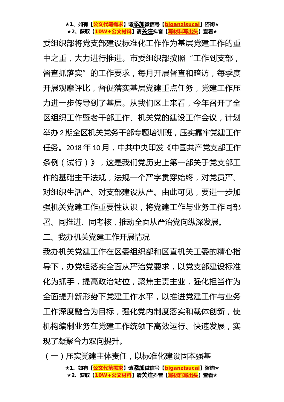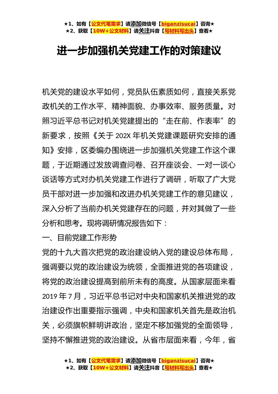 ★1、如有【公文代笔需求】请添加微信号【biganzisucai】咨询★★2、获取【10W+公文材料】请关注抖音【写材料写出头】查看★进一步加强机关党建工作的对策建议机关党的建设水平如何,党员队伍素质如何,直接关系党政机关的工作水平、精神面貌、办事效率、服务质量。对照习近平总书记对机关党建提出的“走在前、作表率”的新要求,按照《关于202X年机关党建课题研究安排的通知》安排,区委编办围绕进一步加强机关党建工作这个课题,于近期通过发放调查问卷、召开座谈会、一对一谈心谈话等方式对办机关党建工作进行了调研,听取了广大党员干部对进一步加强和改进办机关党建工作的意见建议,深入分析了当前办机关党建存在的问题,并对其做了一些分析和思考。现将调研情况报告如下:一、目前党建工作形势党的十九大首...