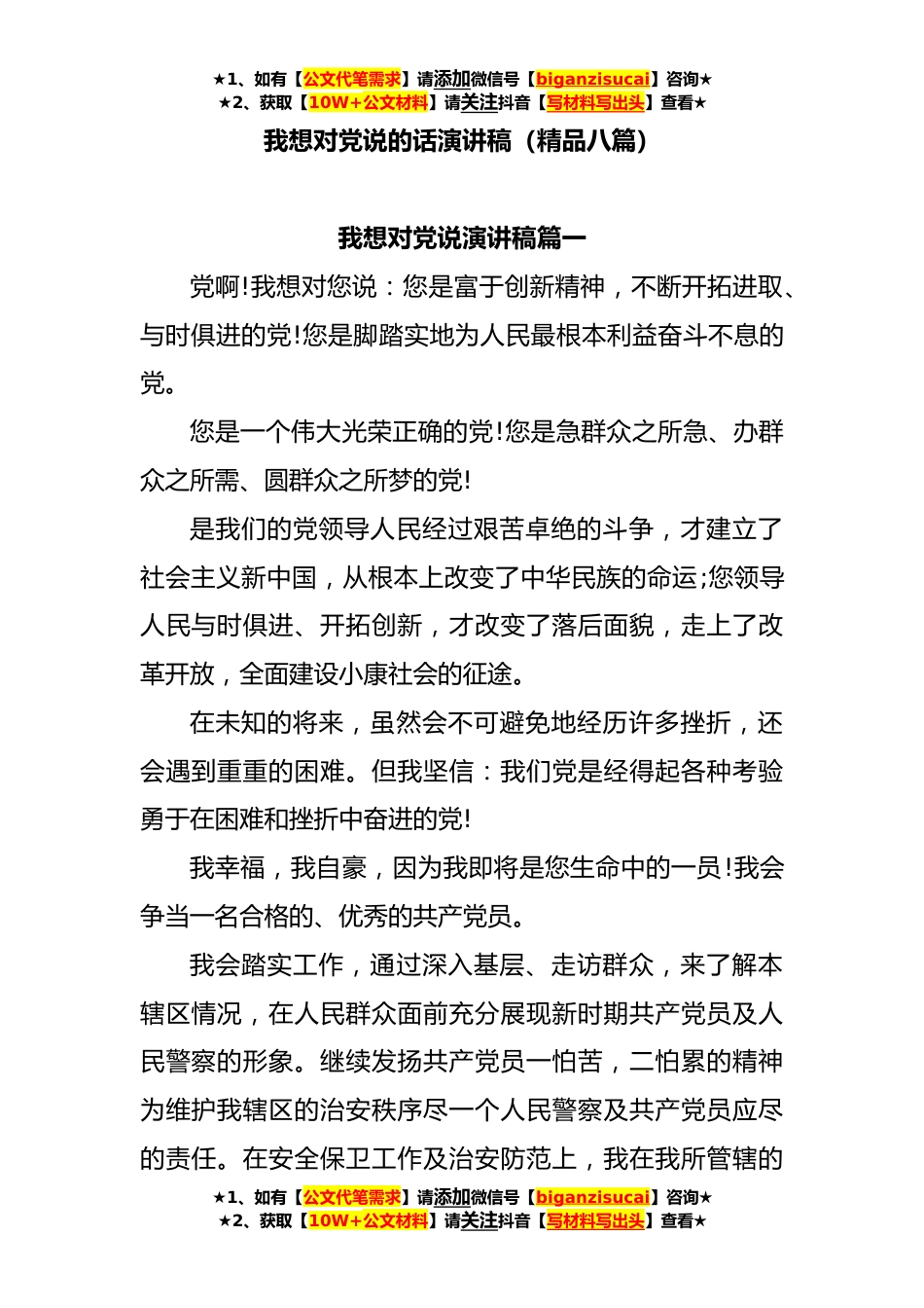 ★1、如有【公文代笔需求】请添加微信号【biganzisucai】咨询★★2、获取【10W+公文材料】请关注抖音【写材料写出头】查看★我想对党说的话演讲稿(精品八篇)我想对党说演讲稿篇一党啊!我想对您说:您是富于创新精神,不断开拓进取、与时俱进的党!您是脚踏实地为人民最根本利益奋斗不息的党。您是一个伟大光荣正确的党!您是急群众之所急、办群众之所需、圆群众之所梦的党!是我们的党领导人民经过艰苦卓绝的斗争,才建立了社会主义新中国,从根本上改变了中华民族的命运;您领导人民与时俱进、开拓创新,才改变了落后面貌,走上了改革开放,全面建设小康社会的征途。在未知的将来,虽然会不可避免地经历许多挫折,还会遇到重重的困难。但我坚信:我们党是经得起各种考验勇于在困难和挫折中奋进的党!我幸福,我自豪...