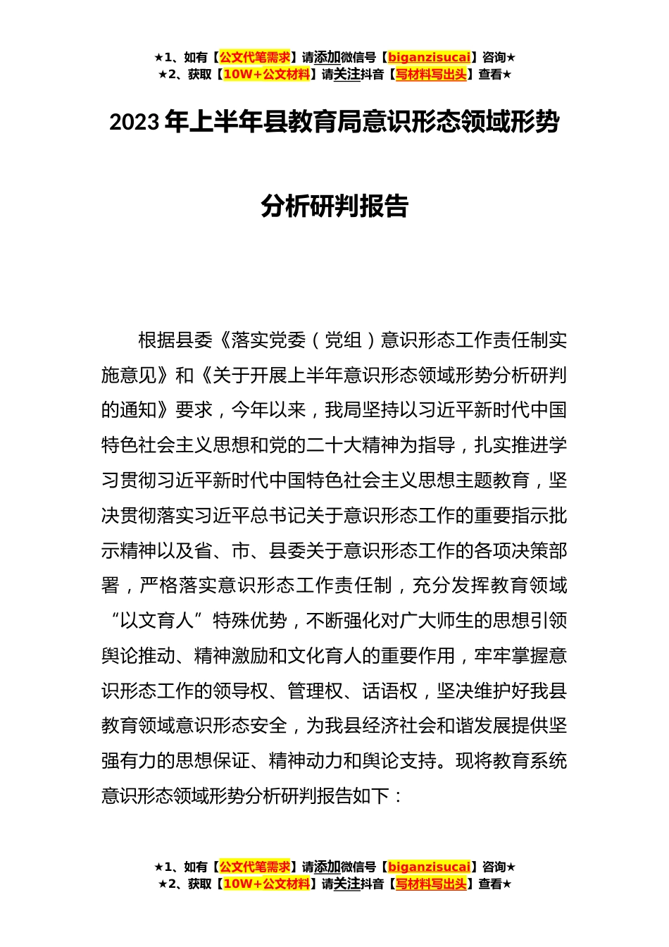 ★1、如有【公文代笔需求】请添加微信号【biganzisucai】咨询★★2、获取【10W+公文材料】请关注抖音【写材料写出头】查看★2023年上半年县教育局意识形态领域形势分析研判报告根据县委《落实党委(党组)意识形态工作责任制实施意见》和《关于开展上半年意识形态领域形势分析研判的通知》要求,今年以来,我局坚持以习近平新时代中国特色社会主义思想和党的二十大精神为指导,扎实推进学习贯彻习近平新时代中国特色社会主义思想主题教育,坚决贯彻落实习近平总书记关于意识形态工作的重要指示批示精神以及省、市、县委关于意识形态工作的各项决策部署,严格落实意识形态工作责任制,充分发挥教育领域“以文育人”特殊优势,不断强化对广大师生的思想引领舆论推动、精神激励和文化育人的重要作用,牢牢掌握意识形...